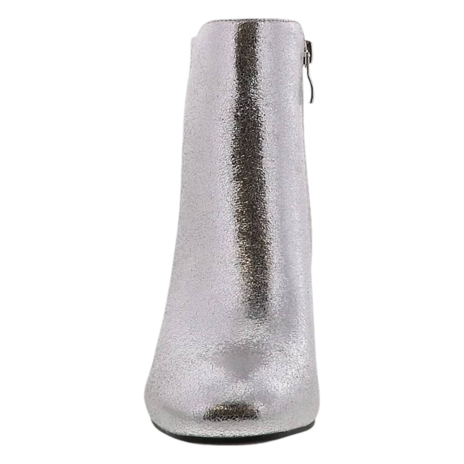 Say hello to the perfect, most versatile boot. The ankle height makes this style easily transition from day to night. Wear them with your favorite skinny jeans and tee for a more laid back look, or pair them with your favorite mini dress and jacket for a night out on the town.Stunning blend of retro charm and contemporary allure. Chic ankle boots radiate groovy vibes. Wrapped block heel and sophisticated square-toe design. Perfectly complemented by a sleek side zipper for easy wear. Crafted with a meticulous attention to detail. Man-made upper, lining, and insole ensure durability and comfort. Dazzling silver hue. Heel height of 3 inches. Weight of 12 ounces. Shaft height of 4 inches.