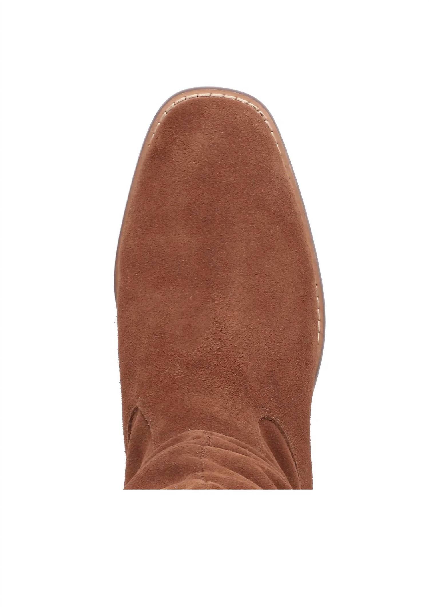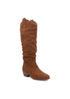 Stunning pair designed for both style and comfort. Crafted from genuine suede leather. Feature a tall slouched 16-inch shaft with an elegant curvy topline and side pull loops for easy wear. Square toe design is complemented by a low 1.7-inch block heel. Enjoy the luxurious feel of MIA's signature contoured footbed.