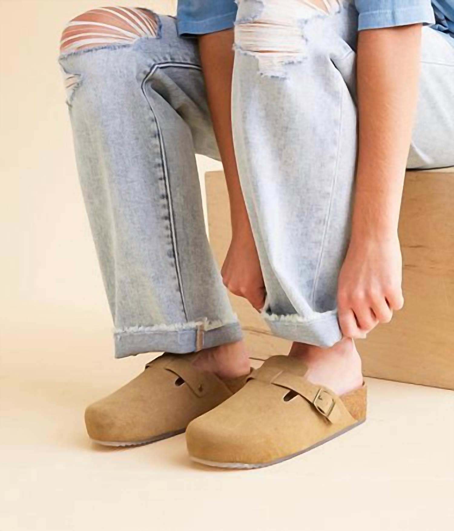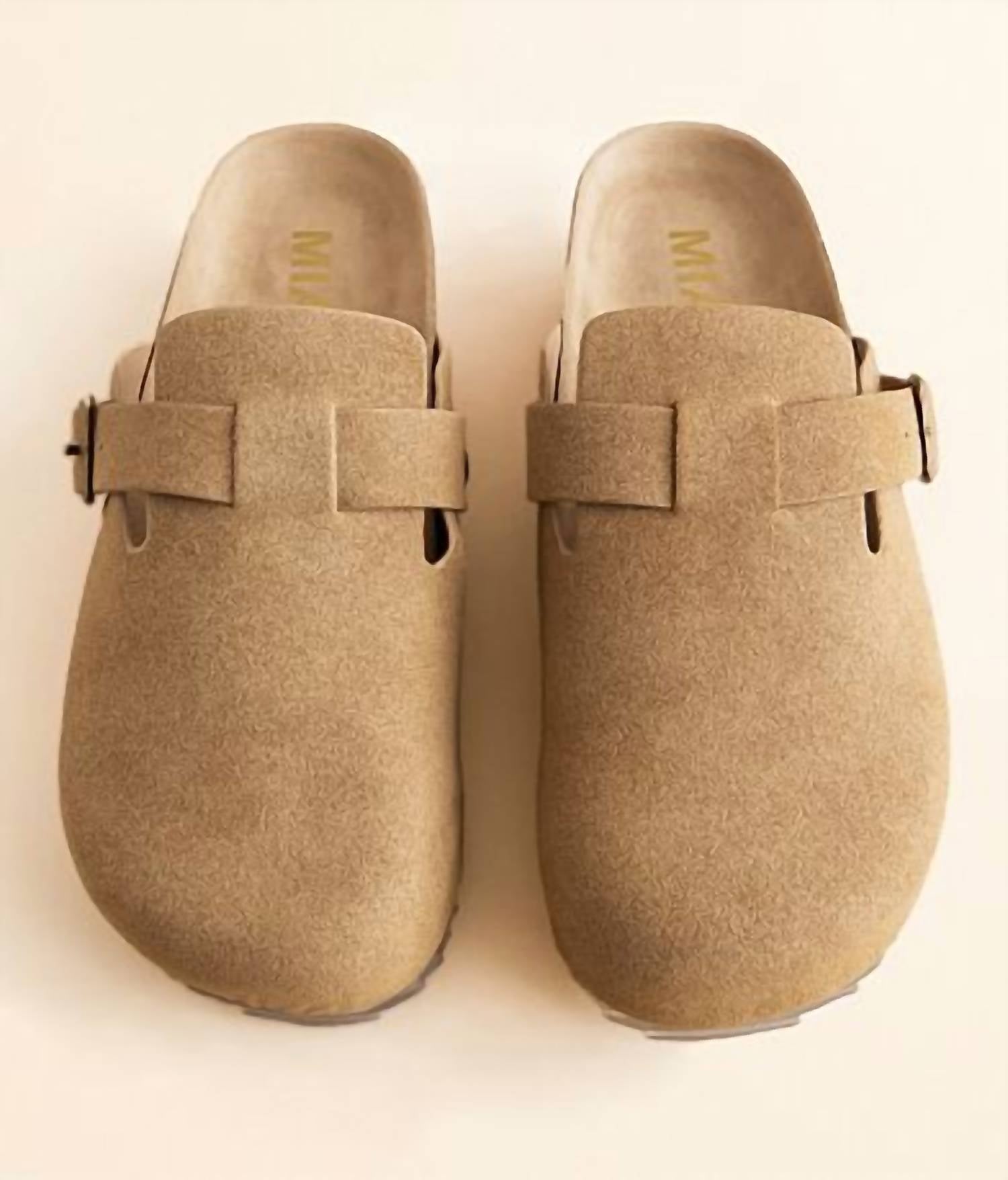 Elevate your style with the Women's Mia Qwest Platform Clogs in a chic taupe hue. Featuring a luxe faux leather upper and a sleek buckle detail, these clogs offer a sophisticated yet modern aesthetic. The comfortable slip-on design, round toe, and cushioned footbed ensure all-day ease, complemented by a sturdy 1 7/8" heel. The rubber sole adds durability, making these clogs perfect for pairing with both wide-leg trousers or flowy dresses.