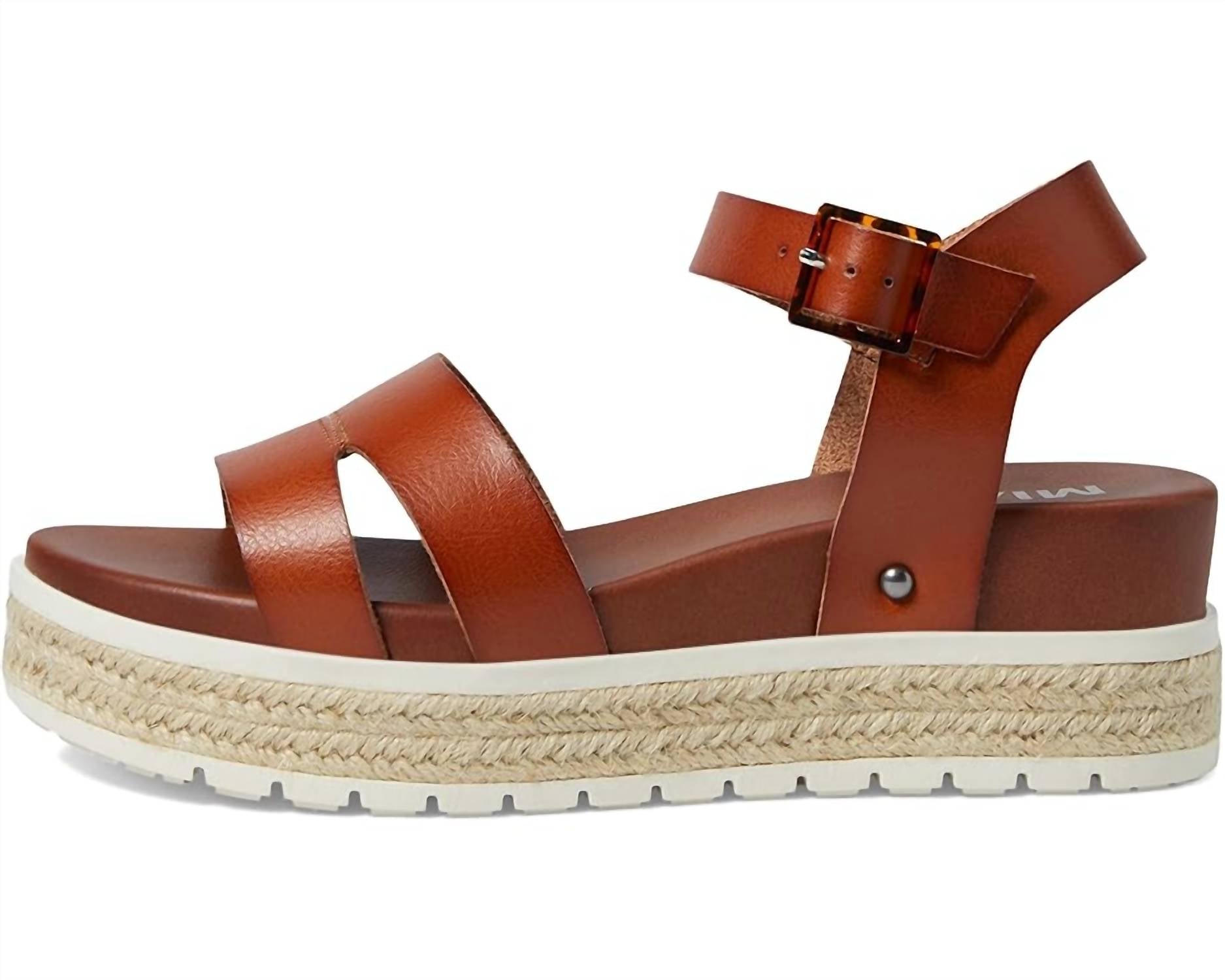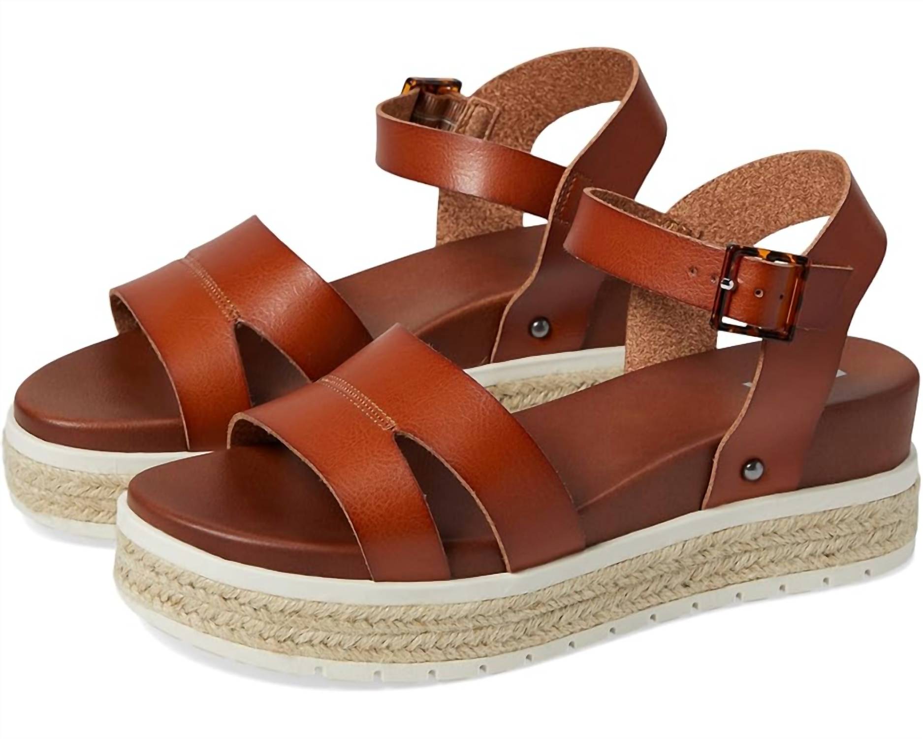 Timeless wedges that will be relevant season after season. Step into style with the Women's Thermopolis Sandals by MIA, expertly crafted in a chic cognac faux leather. These espadrille platform heels boast a fashionable 2.5-inch height with an open round toe silhouette. Featuring an adjustable buckle closure on the ankle strap for a custom fit and a sturdy thermoplastic rubber outsole for reliable traction. Imported, these sandals are perfect for adding a touch of elegance to any outfit.
