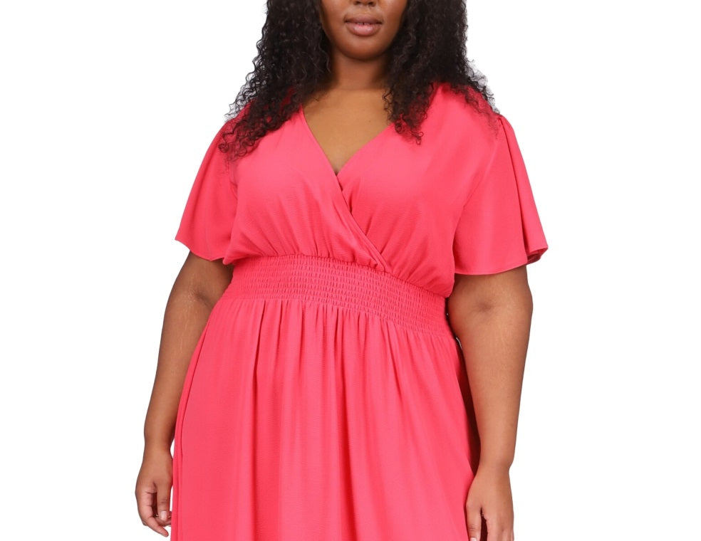 ; Dress up like a diva for the night wearing the Michael Kors Plus Size Solid Hank Hem Dress| V-neckline and short sleeves| Pullover construction| Smocked and elasticized waistband| High-low hemline| 98% polyester| 2% elastane
