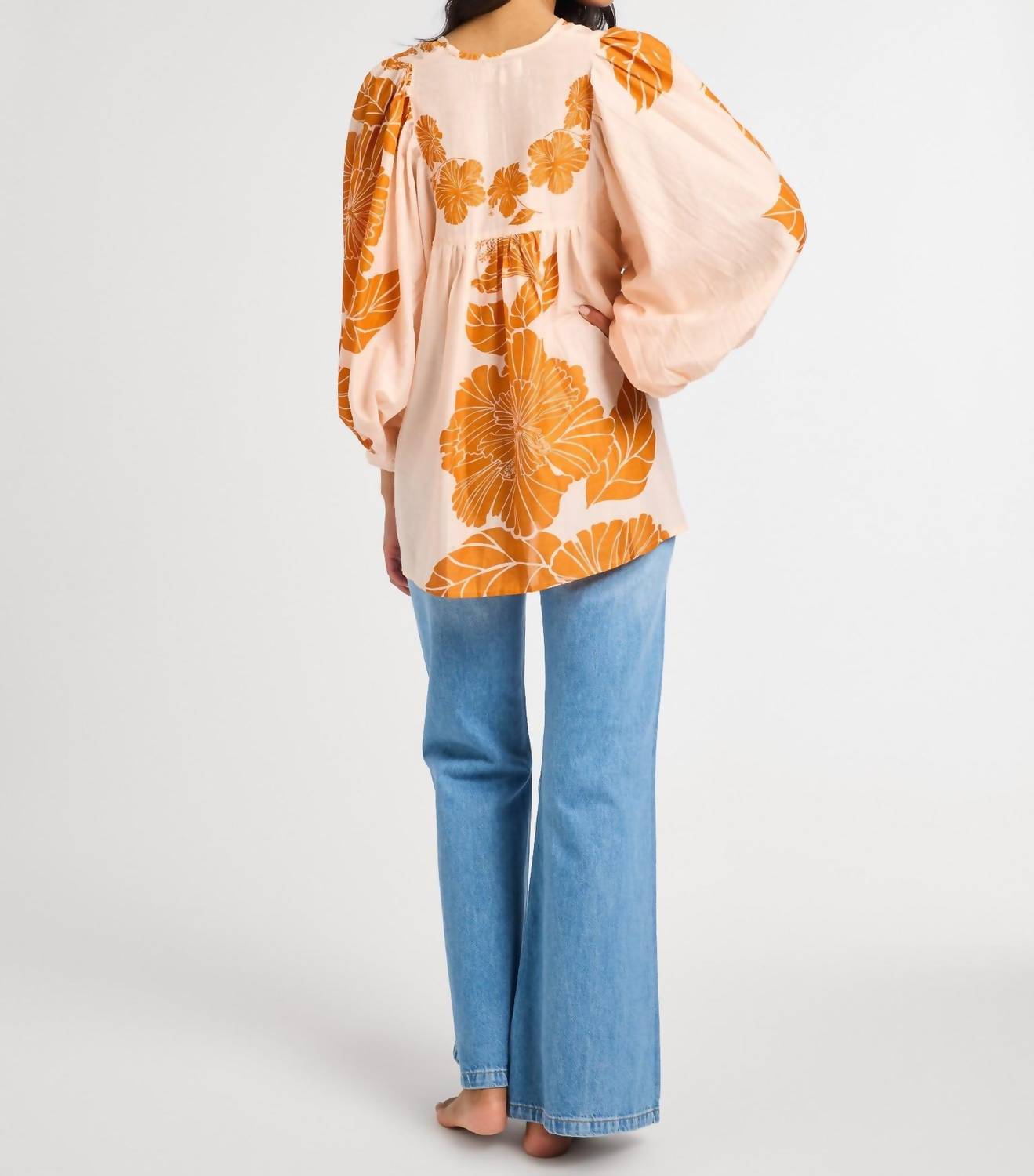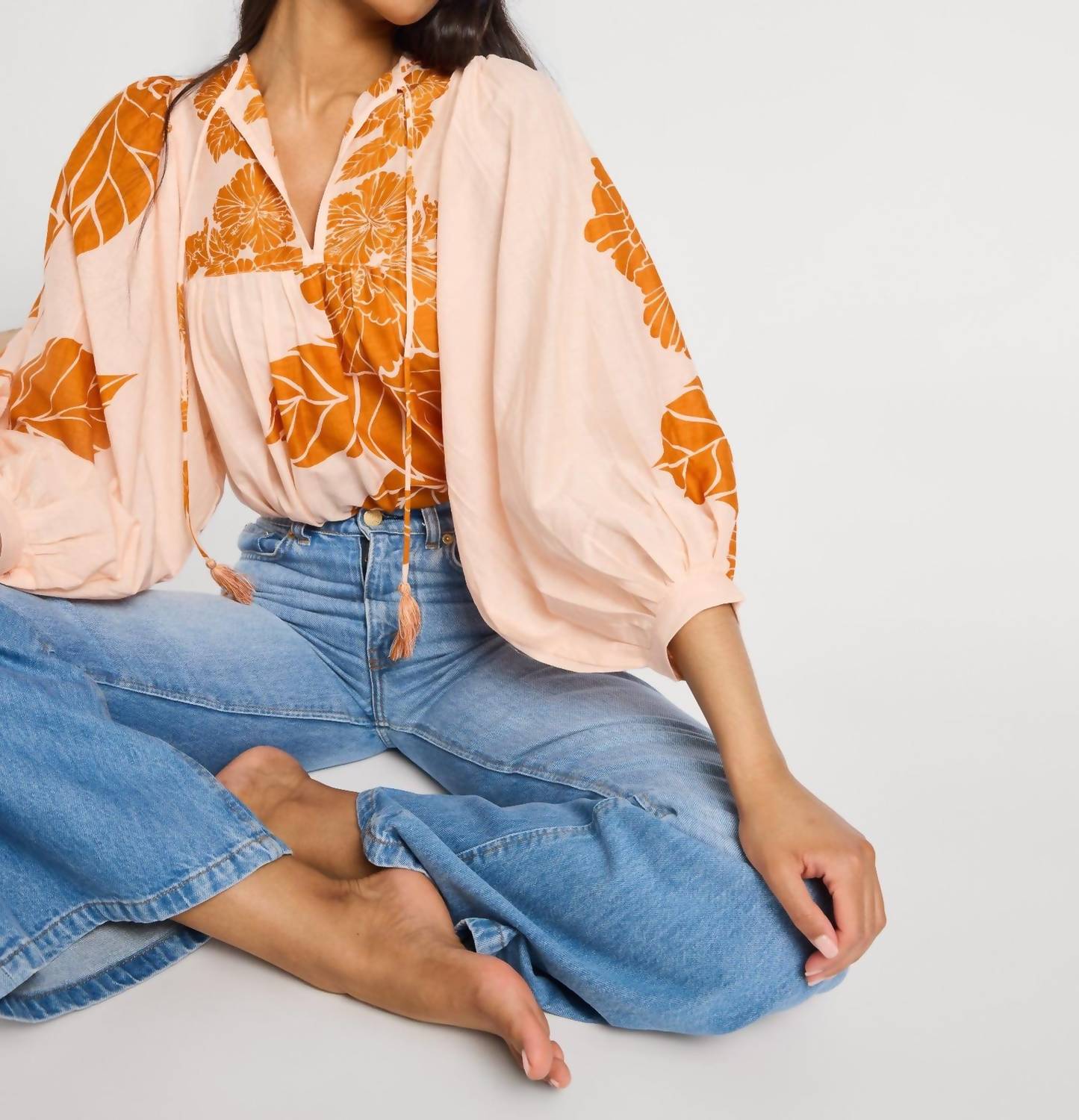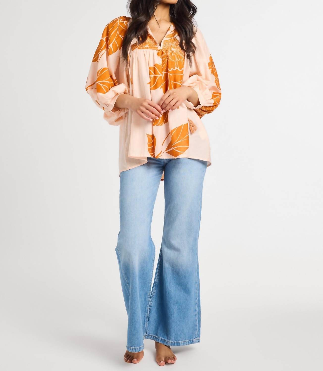 A timeless blouse that will never go out of style. The Charlie Top by MILLE is a charming blouse adorned with a floral pattern in a delightful Hanalei hue. It features three-quarter sleeves and a flattering V-neckline, crafted from a comfortable cotton blend. Easy to wear with a pull-on closure, this top is designed with a women's fit in mind. For care, simply hand wash this elegant piece.