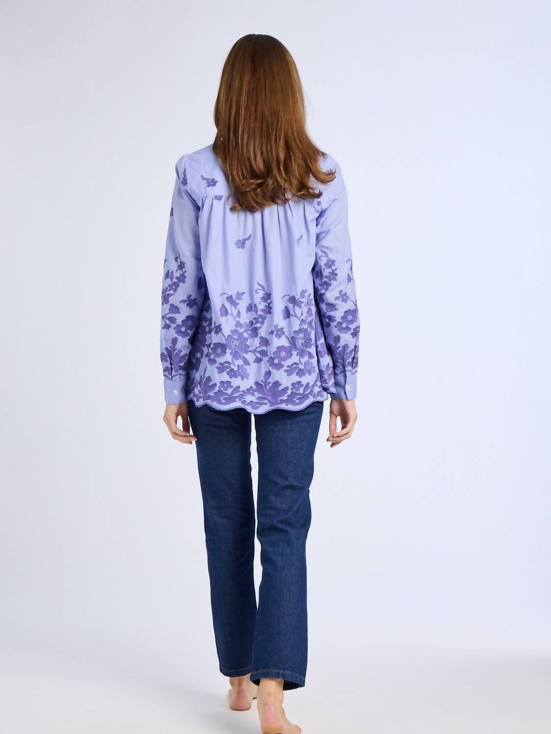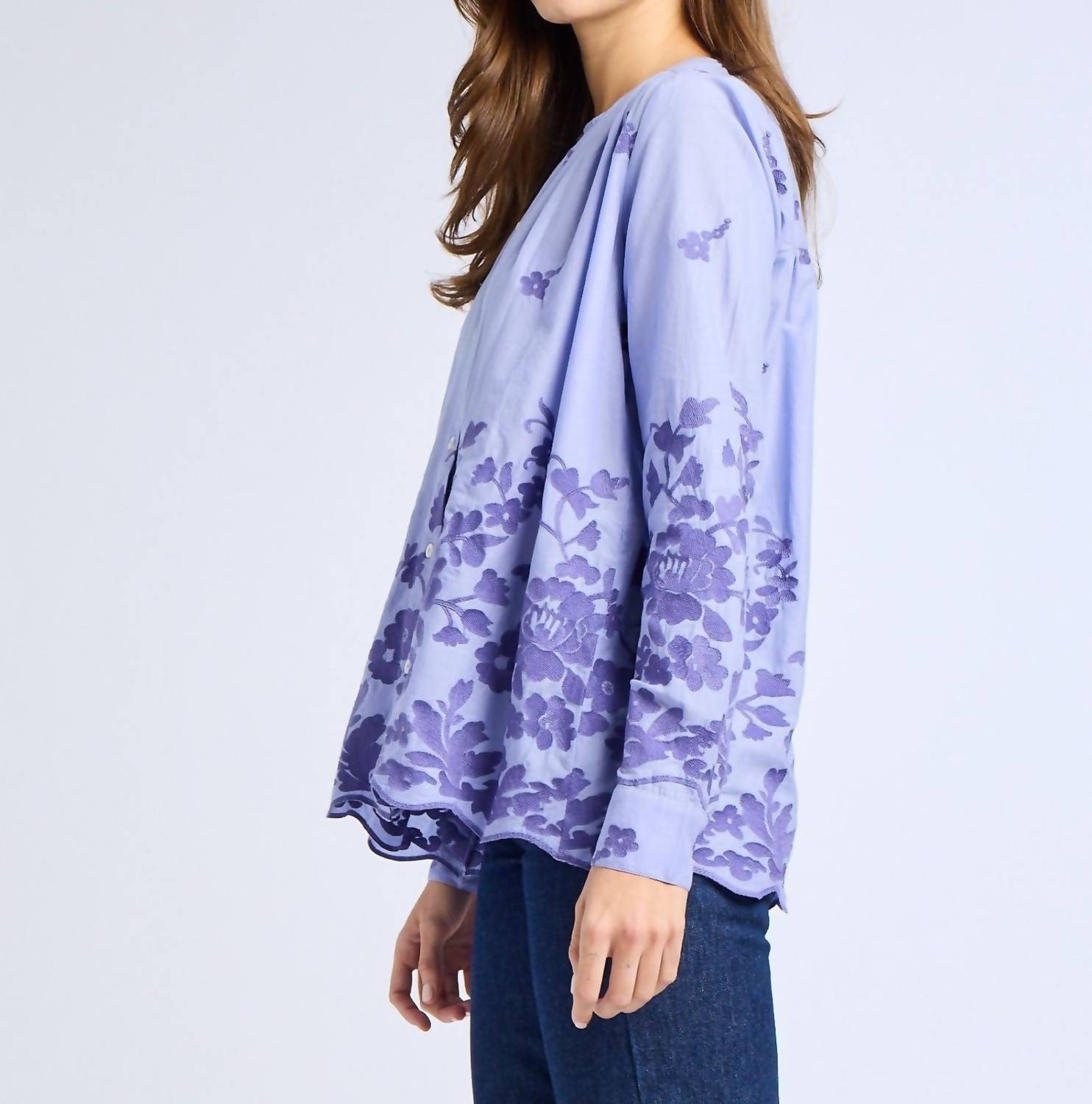 Elevate your wardrobe with the Florian Top by MILLE, a stylish addition in a charming periwinkle shade with a patterned design. This blouse features a collarless, crewneck style with long sleeves and button cuffs, offering a versatile look for various occasions. Crafted from 100% cotton, this piece is perfect for creating a blousy look when tucked. Closure: Button closure. Whether paired with jeans or skirts, it's a highly packable staple ideal for travel.