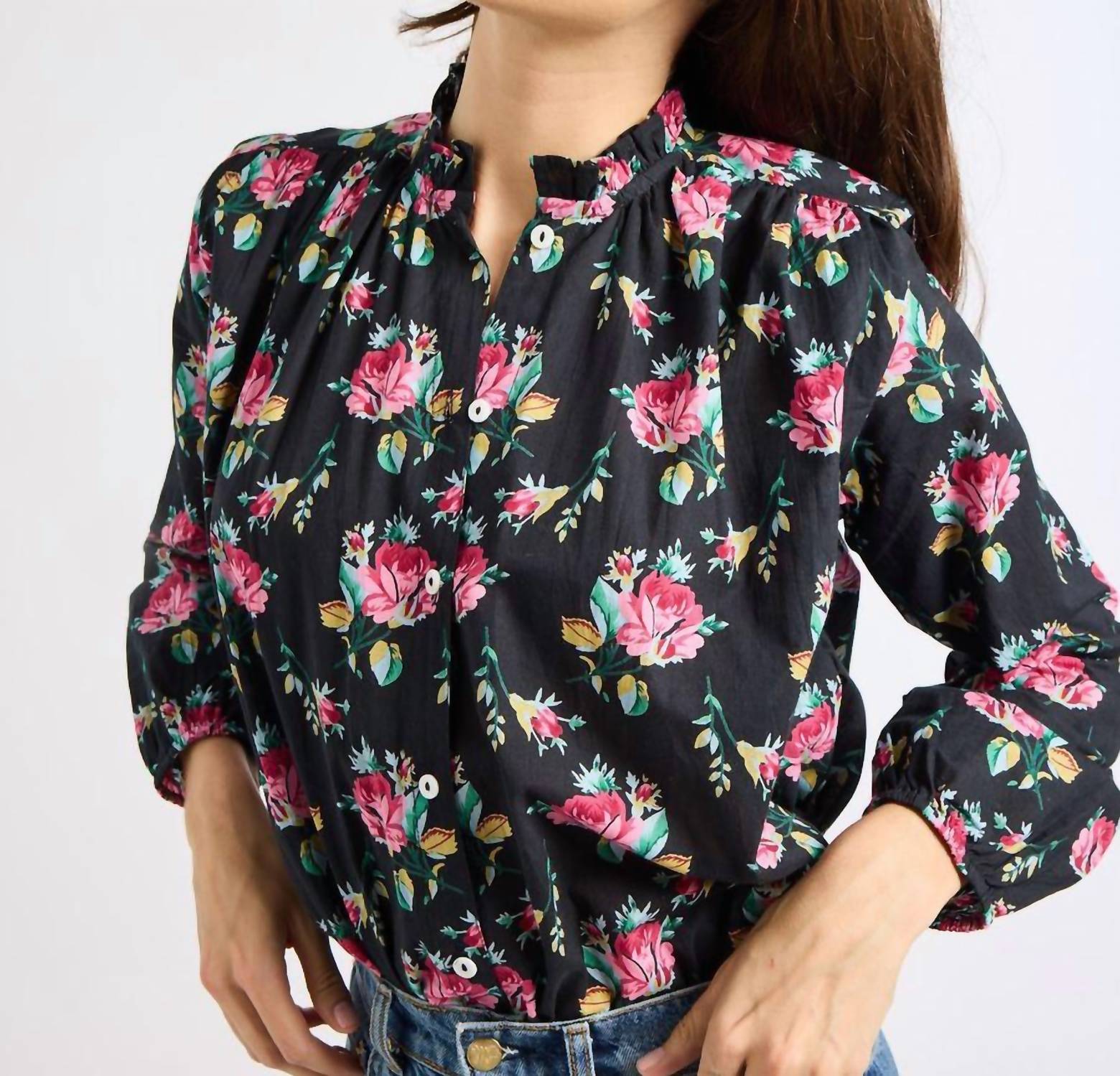 Pair this with your favorite jeans and slides for your next girls night out. Discover the Francesca Shirt by MILLE, a stylish addition to any wardrobe with its black and multicolored floral print. This blouse features long sleeves and a mockneck for a sophisticated look. Made from 100% cotton, it offers comfort and breathability. Closure: Button closure.