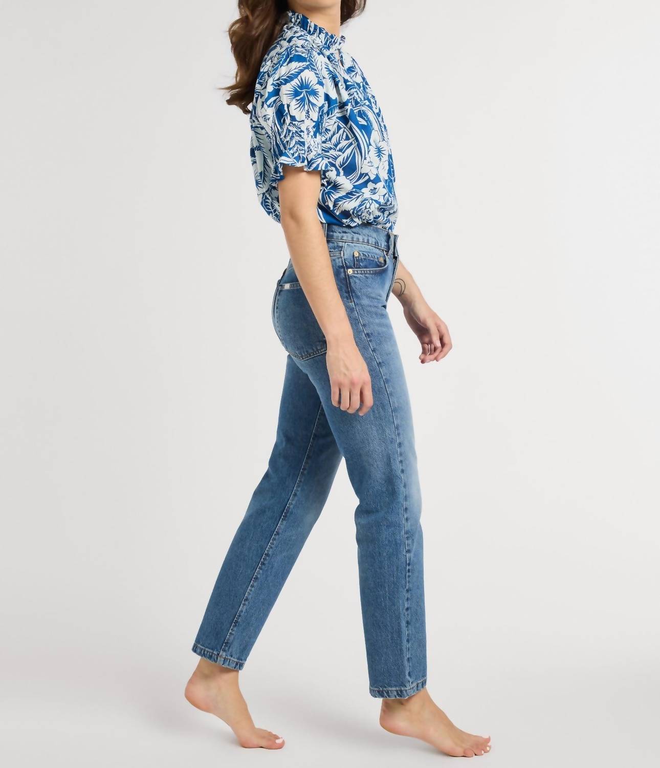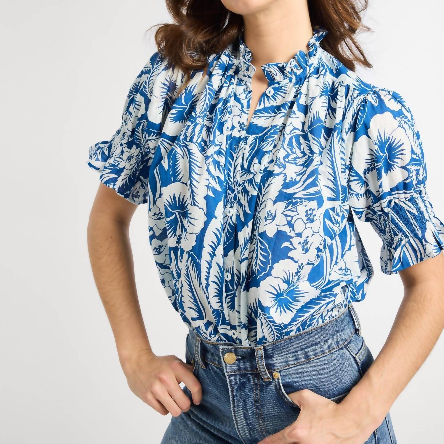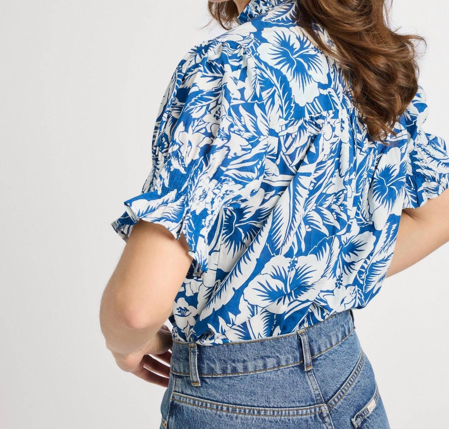 A versatile blouse that works from desk to dinner! Introducing the Marni Top by MILLE, an exquisite choice in a vibrant Blue Hibiscus floral pattern. This blouse showcases short sleeves with smocked elastic cuffs and a charming ruffle detail along the collar neckline. Crafted from 100% cotton, it offers breathable comfort ideal for any season. Enjoy the elegant button closure design in this women's blouse, a graceful addition to any wardrobe.