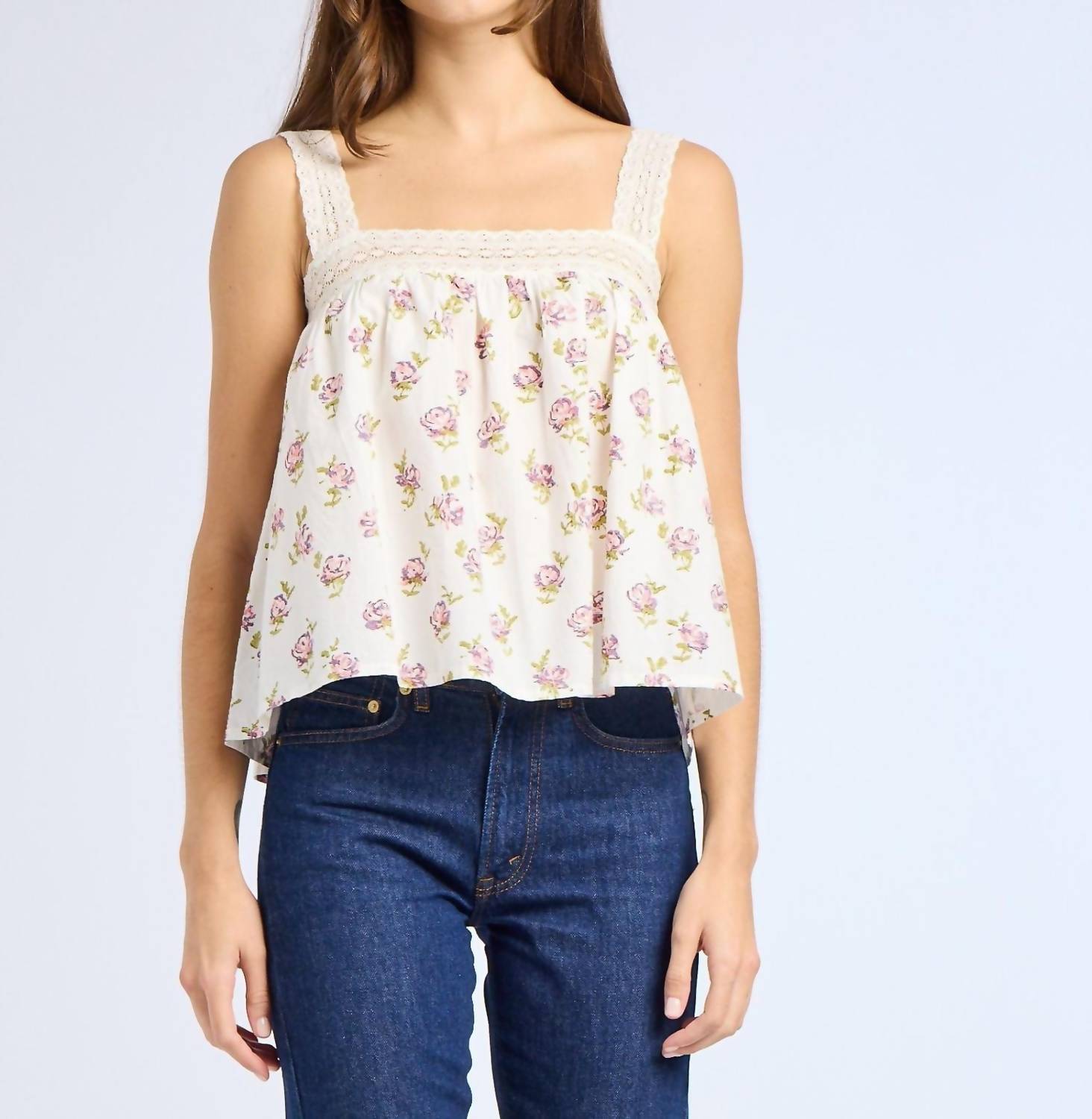 The Sasha top showcases a square neckline accented with delicate cotton lace that extends along the shoulder straps. Designed with a relaxed fit, it offers a gentle, swingy drape through the body. Made from 100% organic cotton for natural comfort and breathability.