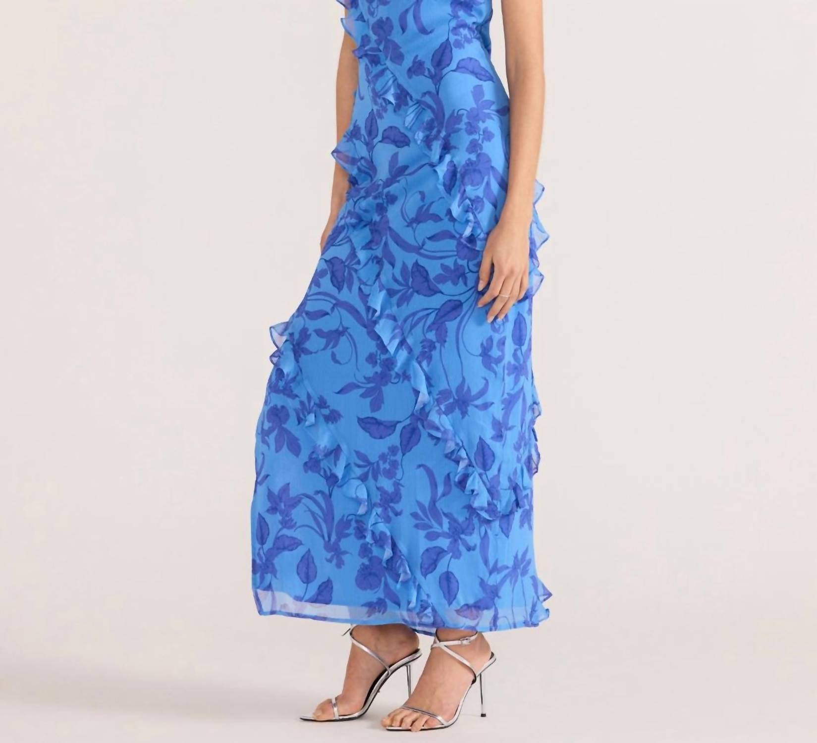 Style this maxi with your favorite statement necklace and sandals for the perfect look. Introducing the Jeanne Ruffle Maxi Dress by MINKPINK, a stunning choice for your next dinner party. Designed with adjustable spaghetti straps and a fashionable A-line silhouette, it offers both comfort and style. This maxi dress in blue floral, crafted from polyester, features a flattering squareneck and a chic side slit detail. It follows a pull-on closure for ease and should be hand washed to maintain its maximalist allure.