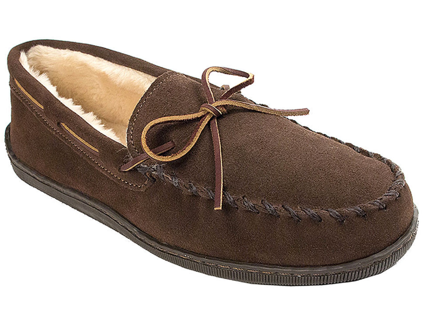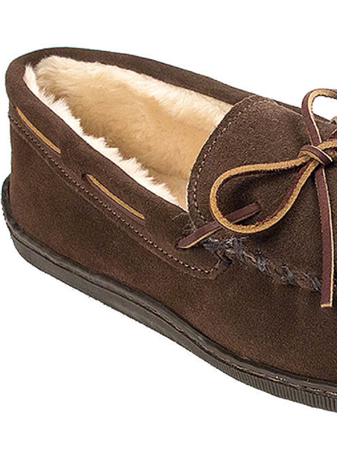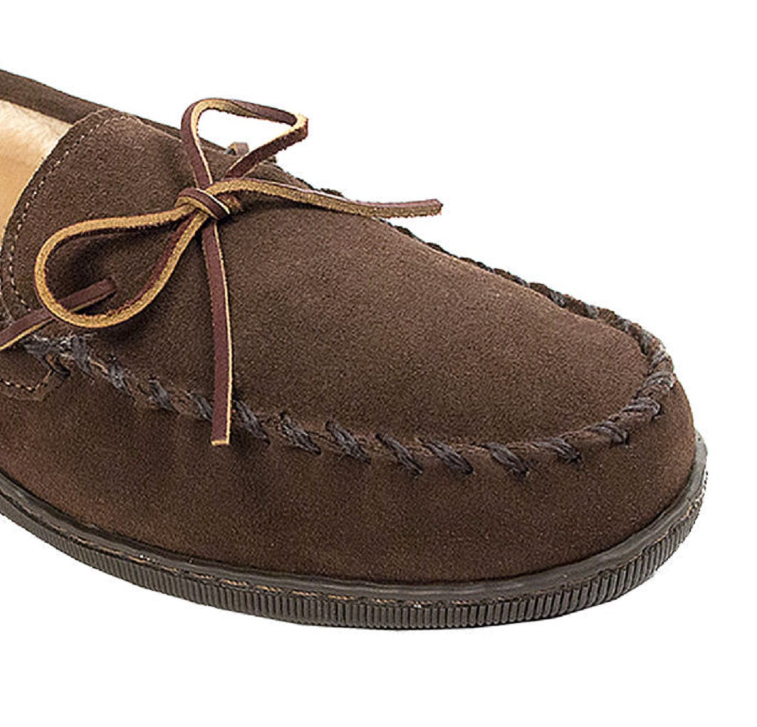 Shoe width - medium|Fit runs true to size|Slip on moc slipper|Indoor and Outdoor wear|This item purchased online must be returned to the vendor by mail only. This item cannot be returned to stores.|Suede Upper and Polyester Lining|Spot Clean