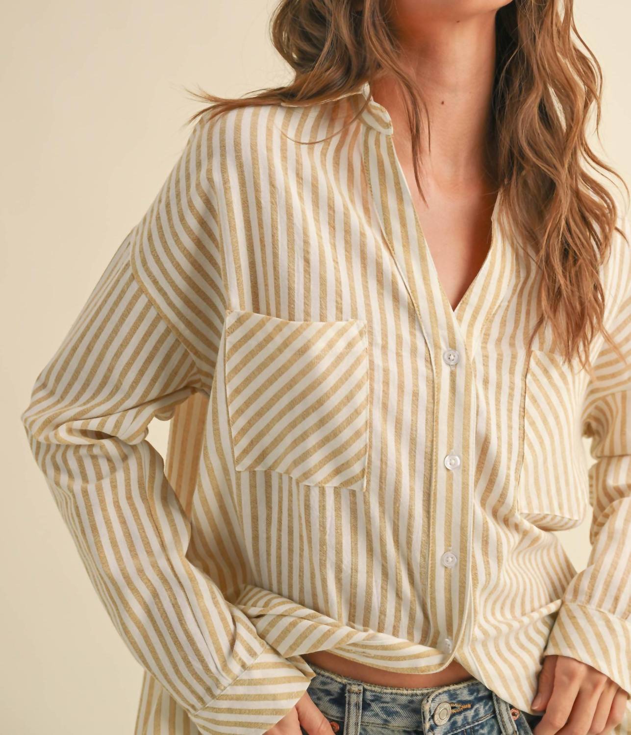 This button down shirt is comfortable yet polished. Meet the Charlie Striped Button Down by MIOU MUSE, a chic beige button-down designed with contrasting stripes for a touch of elegance. This piece is crafted from lightweight cotton, making it an ideal layering option for your fall wardrobe. It features long sleeves and a classic collar for a polished look, complete with a practical button closure and convenient pockets.