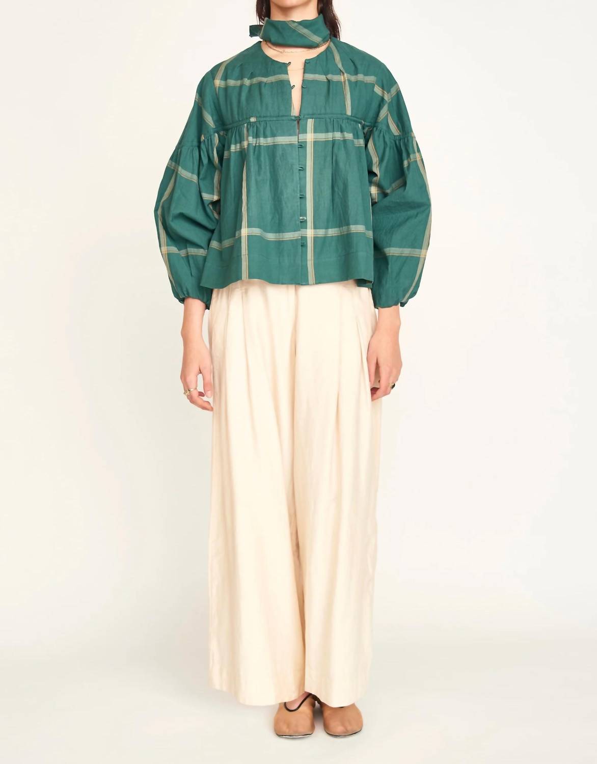 A timeless blouse that will never go out of style. Introducing the Silvertone Blouse by Mirth, a stylish addition to your wardrobe in a vibrant green. This long sleeve, mockneck blouse is crafted entirely from patterned 100% cotton and boasts a partially quilted design for extra flair. The hook and eye closure adds subtle sophistication, while hidden elastic cuffs ensure a tailored fit. Perfect for a dinner party or embracing 90s fashion, simply machine wash and line dry to maintain its charm.