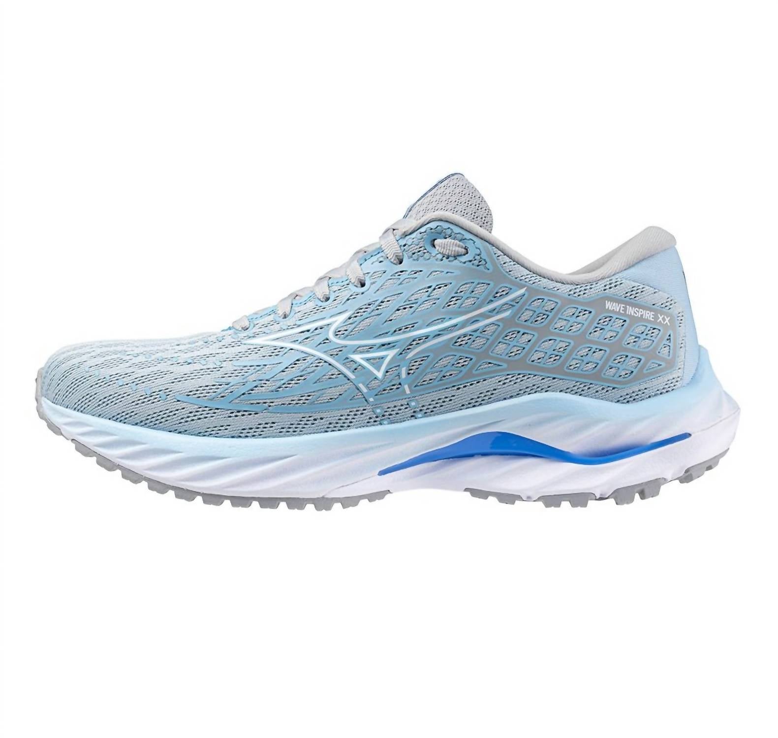 Stylish, comfortable and supportive. These athletic sneakers check all of the boxes. Discover the Women's Wave Inspire 20 Running Shoes by MIZUNO, tailored for enhanced performance in a captivating Cerulean/White colorway. Designed with a Jacquard Mesh Upper and Eco Friendly Materials, these shoes offer support with a 12mm drop and a Stack Height of 26mm/38mm. They feature the innovative MIZUNO ENERZY foam for superior resilience and stability provided by the MIZUNO WAVE® plate. The durable X10 Outsole and gusseted tongue ensure lasting comfort, while weighing just 8.6 oz for a size 8. Perfect for women seeking wide athletic shoes with support and style.