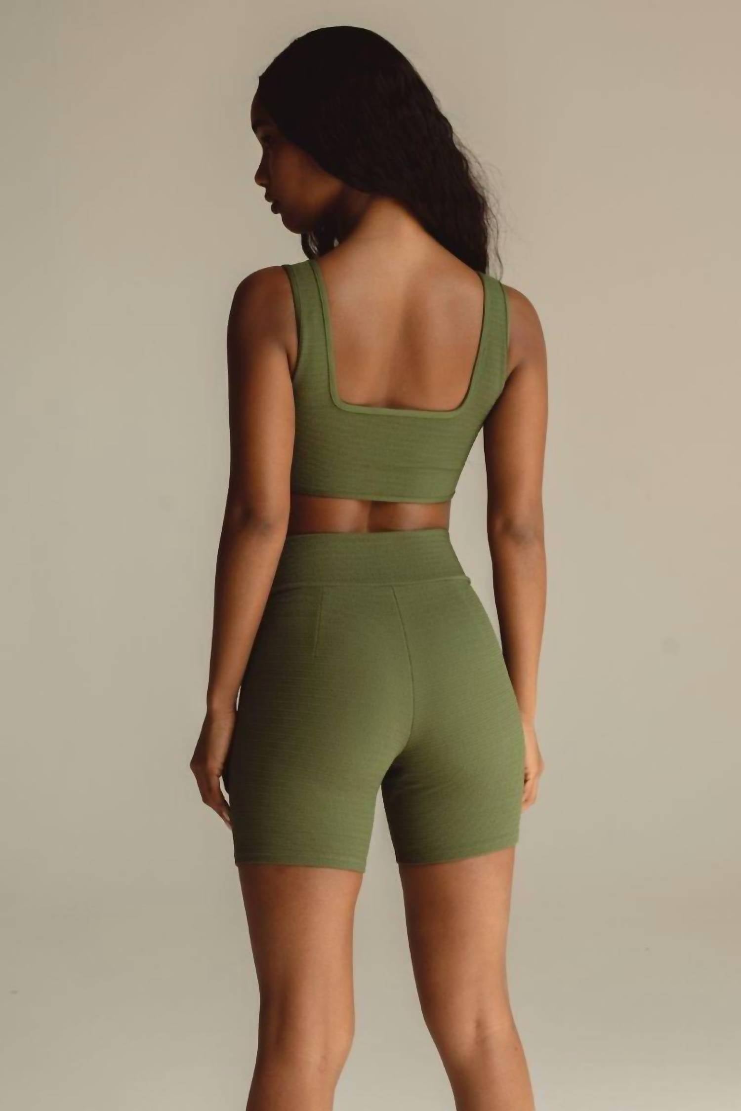 Ideal for relaxed poolside moments, this adorable swimsuit effortlessly transitions into the perfect sunset dinner outfit when paired with a flowing skirt. Discover the Allie Bikini Top by Montce, a chic and versatile swim top that transitions seamlessly from poolside to athleisure. With thick straps and a flattering square neckline, it offers high support and a subtle lift for optimal comfort. Crafted from a textured micro scrunch nylon/spandex blend with extra stretch, this piece is designed in a solid dark olive green hue, featuring fabric imported from Spain. Care: Hand wash for best results. Perfect for summer fitness or workout occasions.