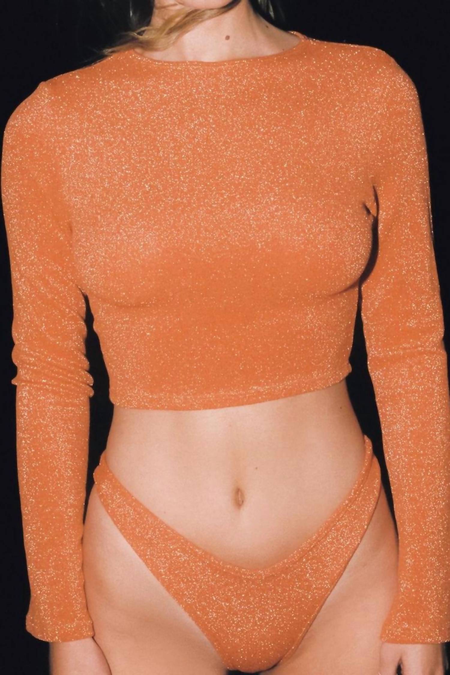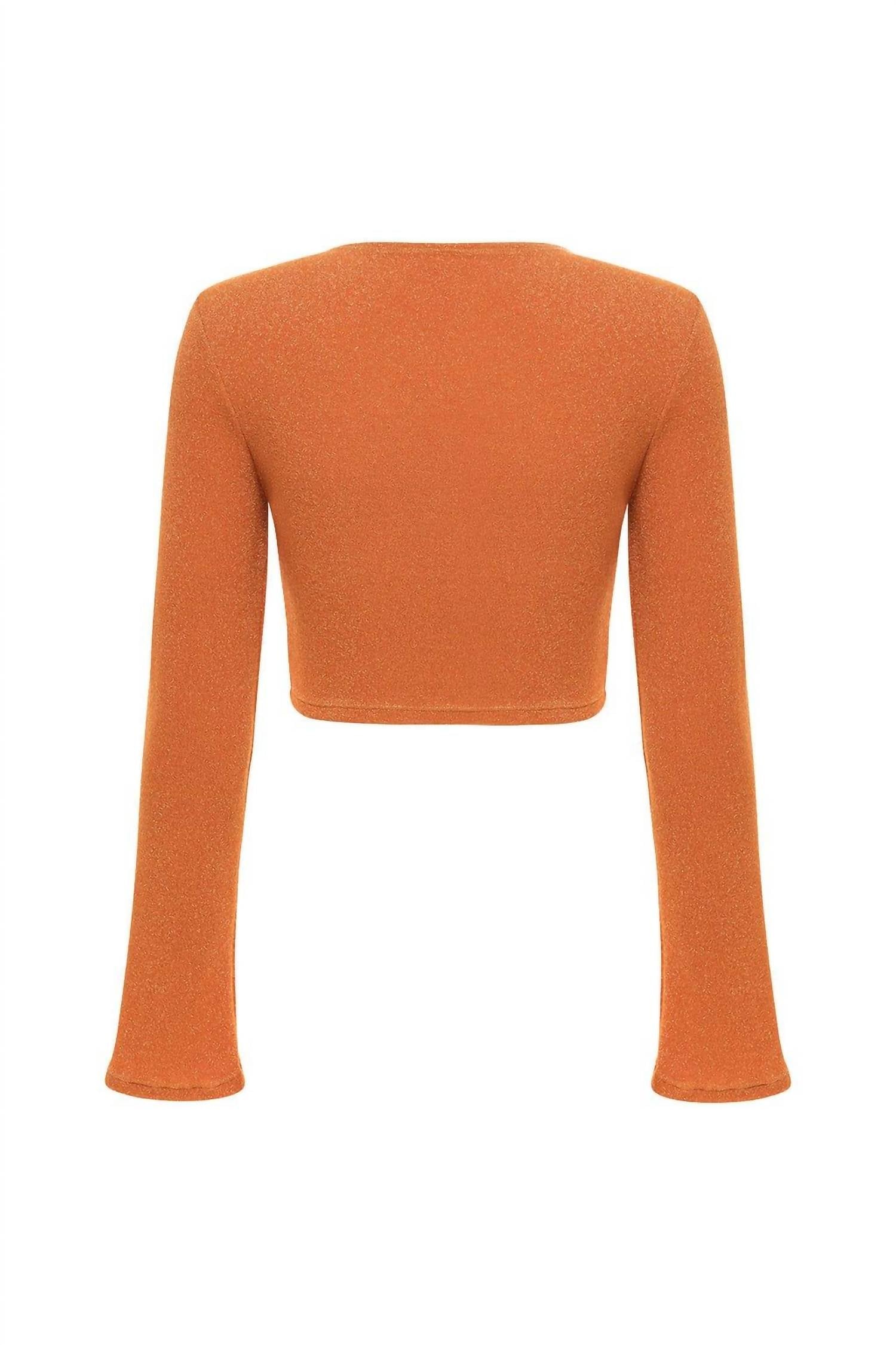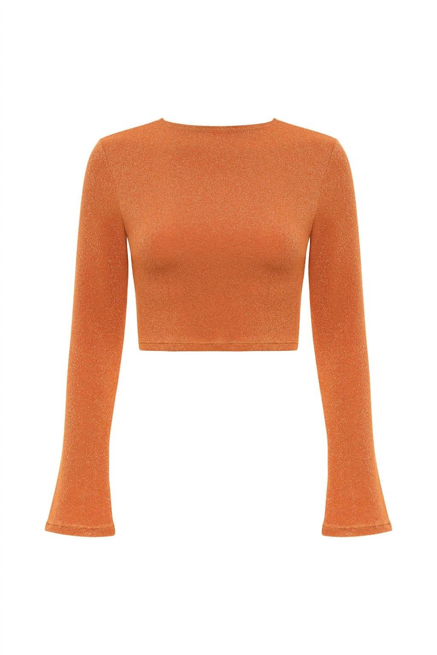 Pair this crop top with your favorite high-waisted jeans or maxi skirt. Elevate your summer wardrobe with the Montce Flair Solidad Crop Top in Terra Sparkle. Showcasing elegant flared long sleeves and a flattering crew neckline, this textured crop top offers a slim fit for a chic, modern look. Made for ease with a pull-on style, it pairs effortlessly with your favorite high-waisted pieces. Care instructions recommend a gentle hand wash to preserve the delicate fabric.