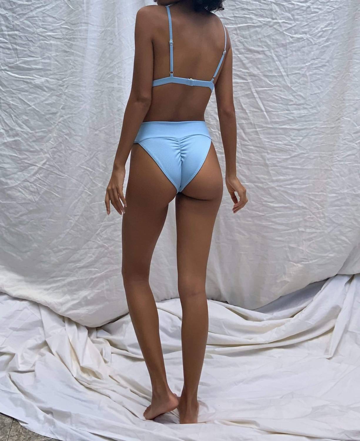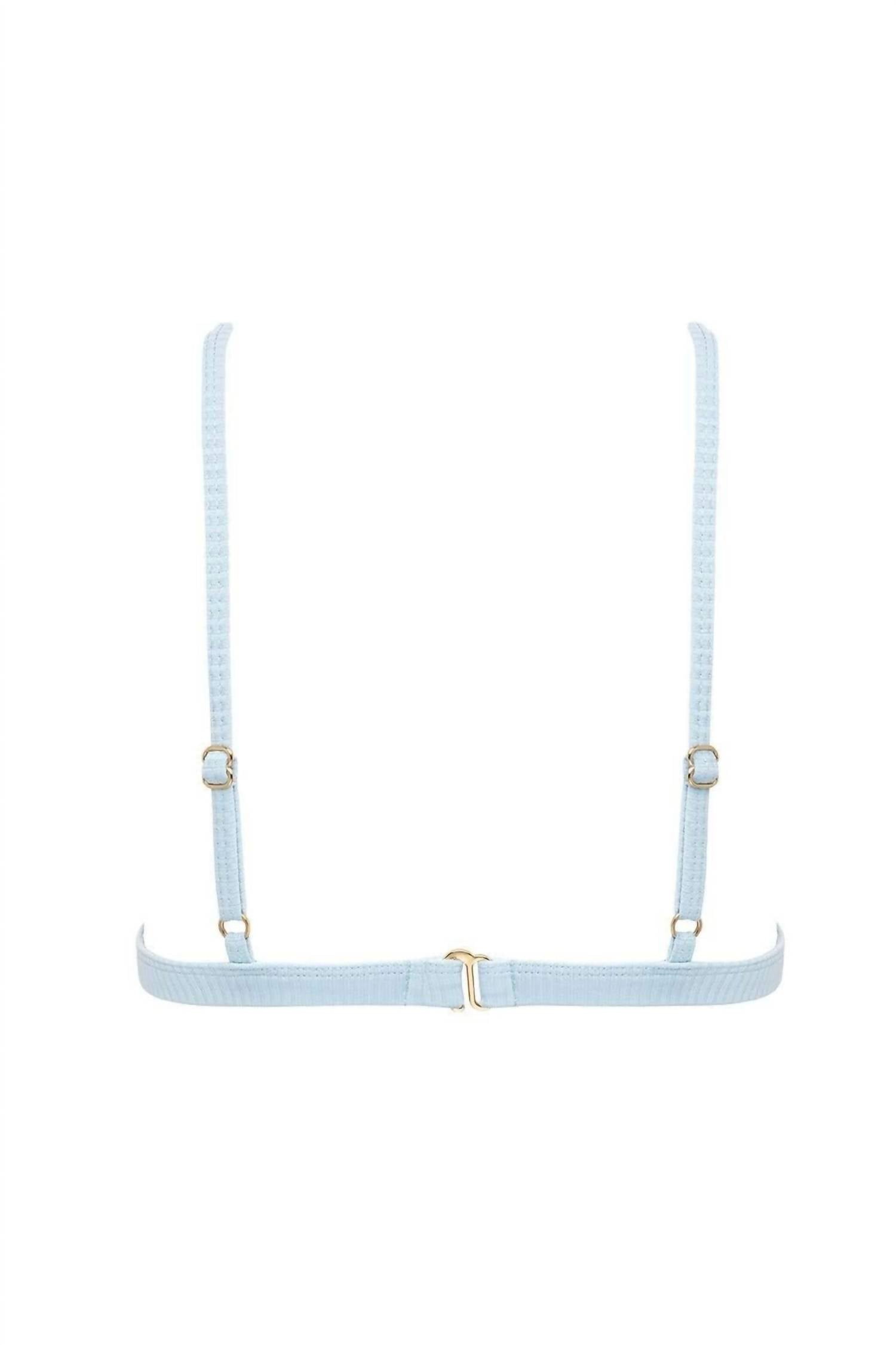This cute and flattering swimsuit is perfect for making a splash at the pool, lounging on sun-kissed beaches, and staying stylish throughout the upcoming summer season. Introducing the Hunter Triangle Bikini Top by Montce, a chic swimwear piece in a solid periwinkle blue hue, perfect for showing off minimal tan lines. This women's medium support bikini top boasts adjustable shoulder straps and an adjustable back hook closure, featuring light padding and gold tarnish-resistant metal hardware. Made from a buttery soft ribbed material, it is composed of a stretchy nylon and spandex blend, with fabric imported from Brazil. Care: Hand wash and line dry for long-lasting wear.