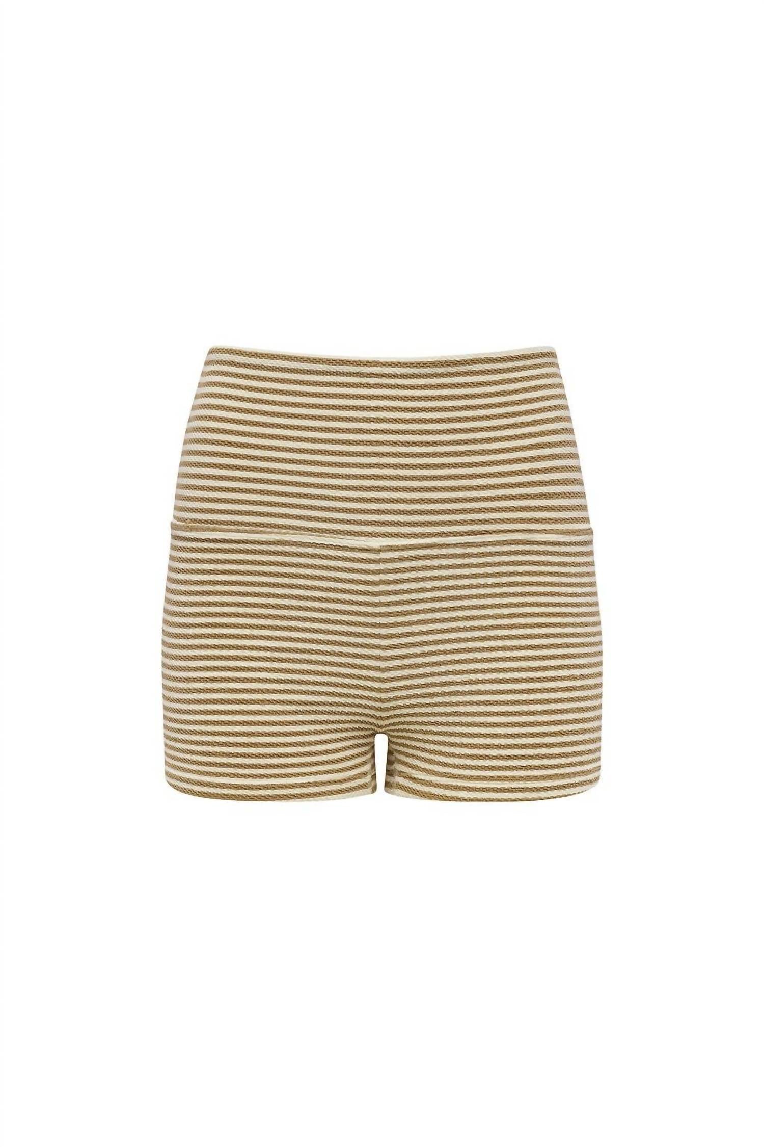Pair these with an oversized tee for the ultimate cool-girl vibe. Discover the Montce Micro Bike Short, crafted in a stylish tan and beige striped pattern ideal for a minimalist summer look. With an approximate 2" inseam and a high-rise fit, this piece features light compression and a wide, contouring waistband for superb comfort. Made from a blend of 90% nylon and 10% spandex, this thick and textured fabric is imported from Spain and features OEKO-TEX certification. Closure: Pull on. Care: Machine wash and line dry. Make these versatile shorts your go-to for loungewear, light exercise, or as a chic swim bottom.