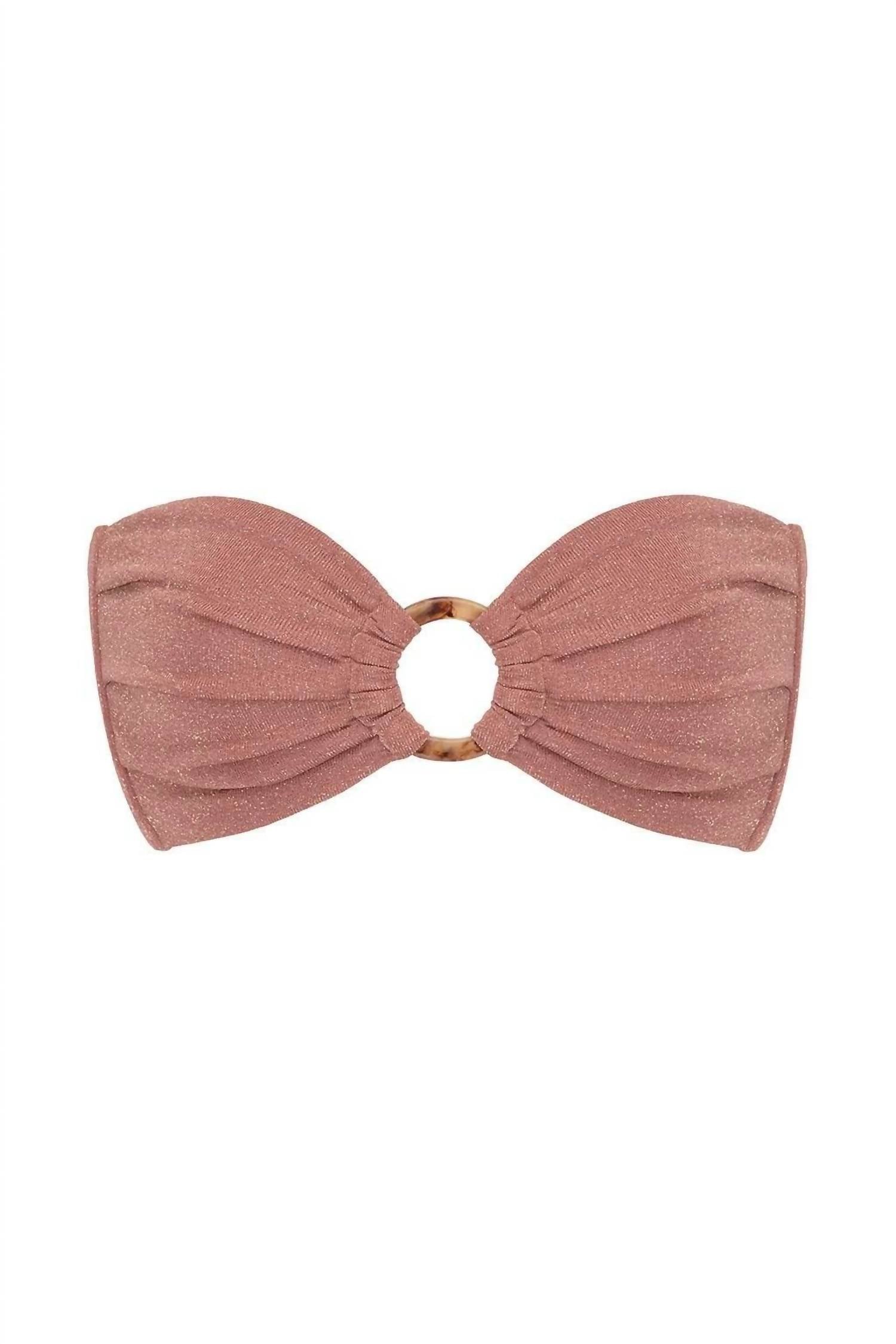 Dream of your next beach getaway in this cute little number. Pair with strappy sandals, a floppy hat, and an oversized tote to complete the perfect vacation look. Introducing the Tori Ties Bandeau Bikini Top by Montce, a chic swim staple in a stunning mauve sparkle. This strapless bandeau silhouette features a flattering sweetheart neckline and ruched detailing, perfect for achieving minimal tan lines. Its adjustable self-tie closure and medium support side seam boning ensure a comfortable fit, complemented by the luxe faux tortoise shell hardware. Made from a textured sparkle fabric, a blend of Viscose, Lurex, Polyester, and Spandex, and imported from Bulgaria, this piece requires hand washing to maintain its charm for many beach days to come.