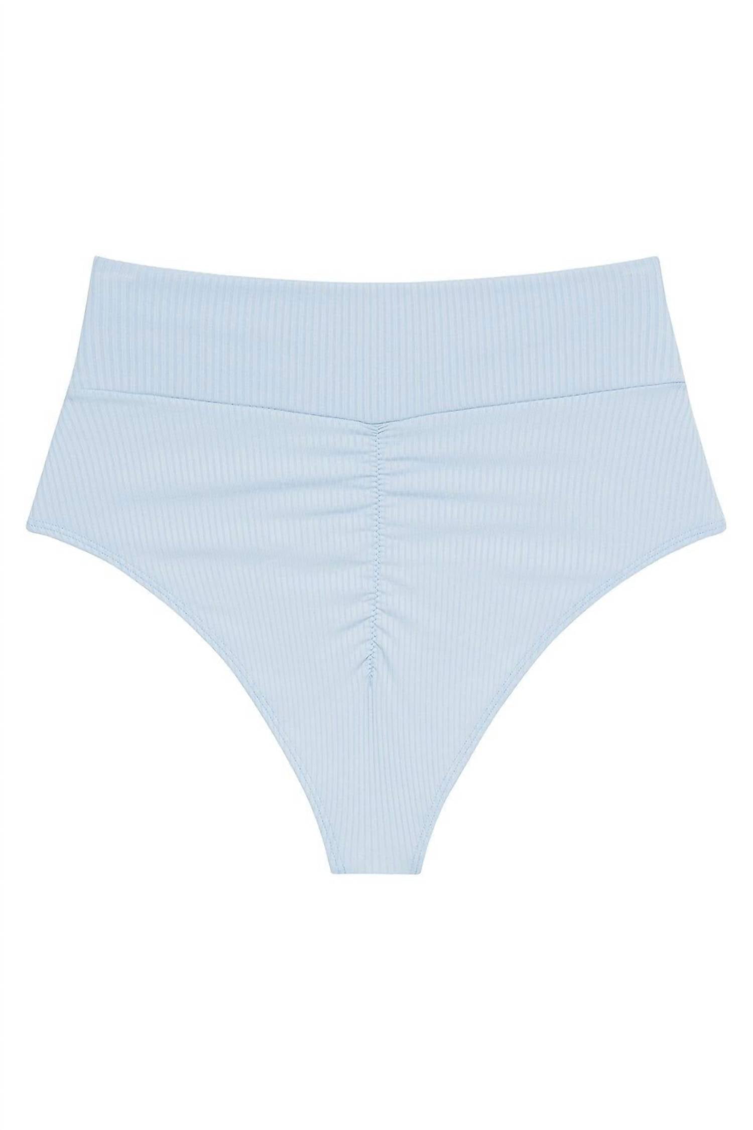 Dream of your next beach getaway in this cute little number. Pair with strappy sandals, a floppy hat, and an oversized tote to complete the perfect vacation look. Introducing the Women's Added Coverage High Rise Bikini Bottom by Montce in a delightful Periwinkle Blue hue, perfect for a minimalist beach day look. This high-rise bikini bottom offers full front coverage with moderate back coverage and features a thick, compressive contouring waistband. Crafted from a buttery soft ribbed material, this piece is a nylon/spandex blend with fabric imported from Brazil, designed to stretch and fit beautifully on the body. Care: Hand wash recommended.