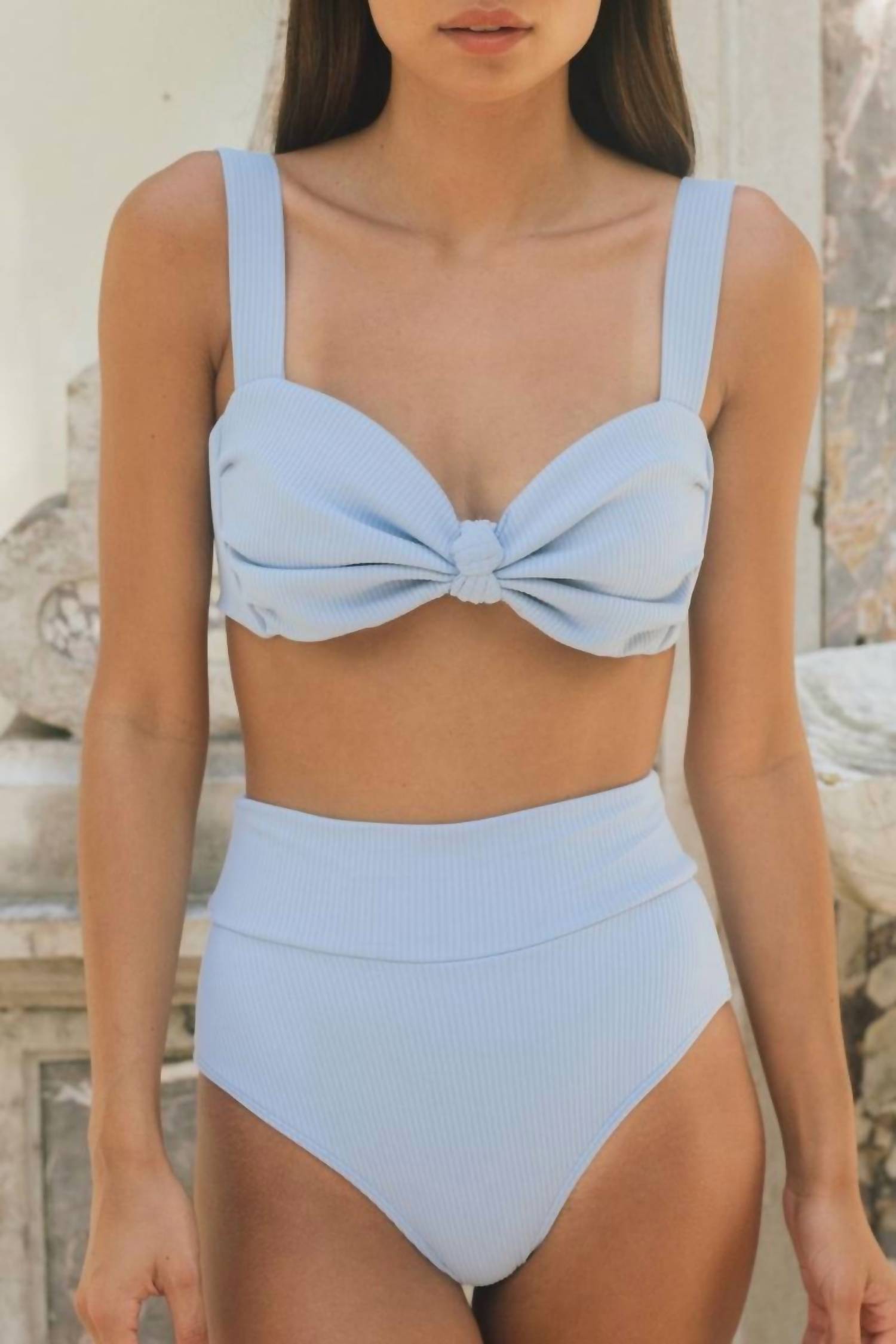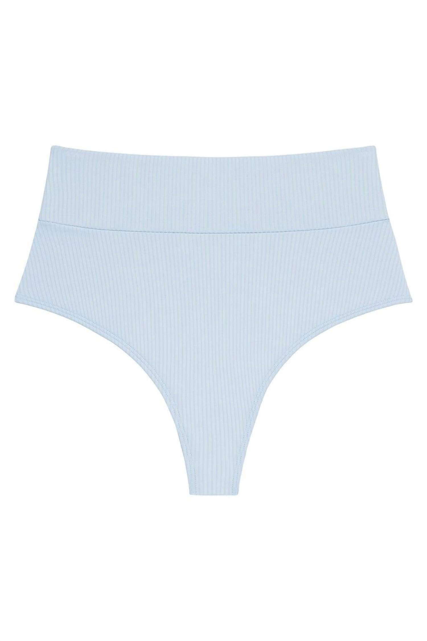 Introducing the Women's Added Coverage High Rise Bikini Bottom by Montce in a delightful Periwinkle Blue hue, perfect for a minimalist beach day look. This high-rise bikini bottom offers full front coverage with moderate back coverage and features a thick, compressive contouring waistband. Crafted from a buttery soft ribbed material, this piece is a nylon/spandex blend with fabric imported from Brazil, designed to stretch and fit beautifully on the body. Care: Hand wash recommended.