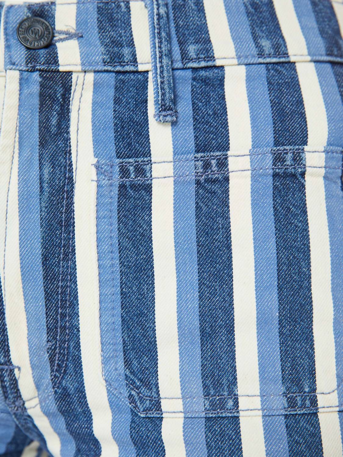 Introducing the Patch Pocket Twister Sneak Pants by Mother, a stylish addition to your wardrobe with their flattering wide-leg design and versatile when attending a dinner party or holiday gathering. These pants boast a 10" rise, a comfortable 32" inseam, and a 26 1/2" leg opening, crafted entirely from 100% cotton for breathability and comfort. Made in Los Angeles, these indigo wash pants feature vertical dark blue, light blue, and white stripes with functional patch pockets. Ensure lasting wear with convenient machine wash and tumble dry instructions.
