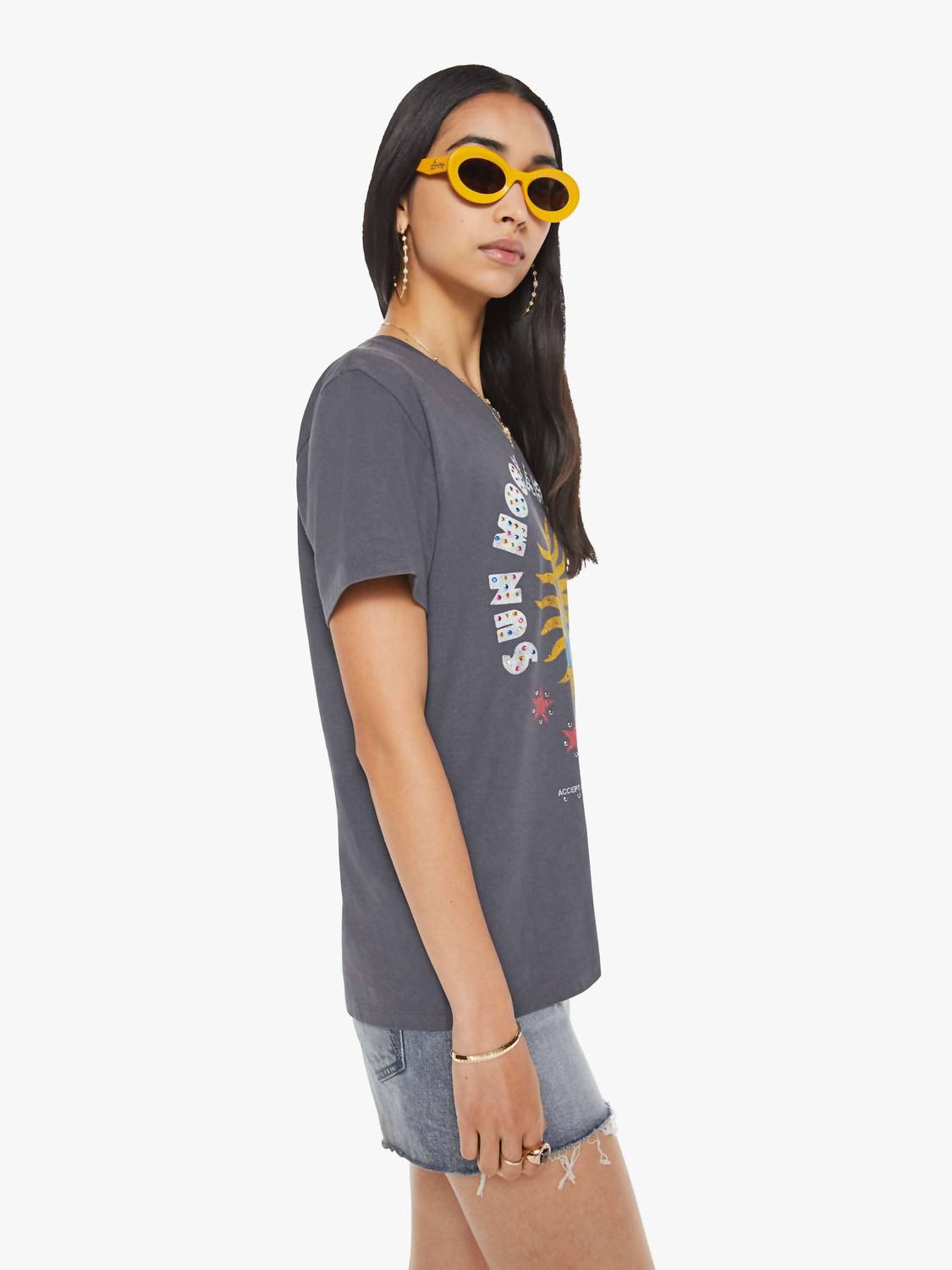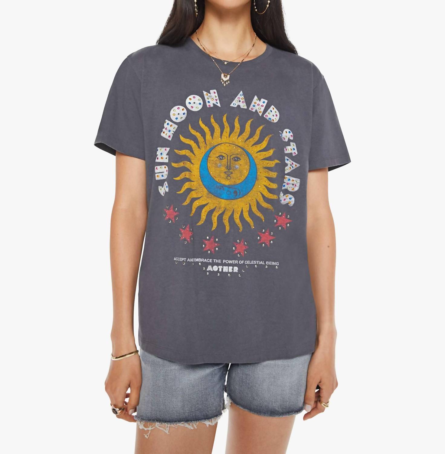 This classic, short sleeve tee will be your go-to staple this season and beyond. Introducing the Rowdy Mother Tee by Mother, a captivating graphic tee that perfectly combines style and comfort for your summer vacation. This grey crewneck features short sleeves and a striking bedazzled Moon and Stars detail, making it a standout piece. With its easy pull-on closure, it's designed for effortless wear. Crafted without pockets, this tee is an essential for warm-weather getaways.