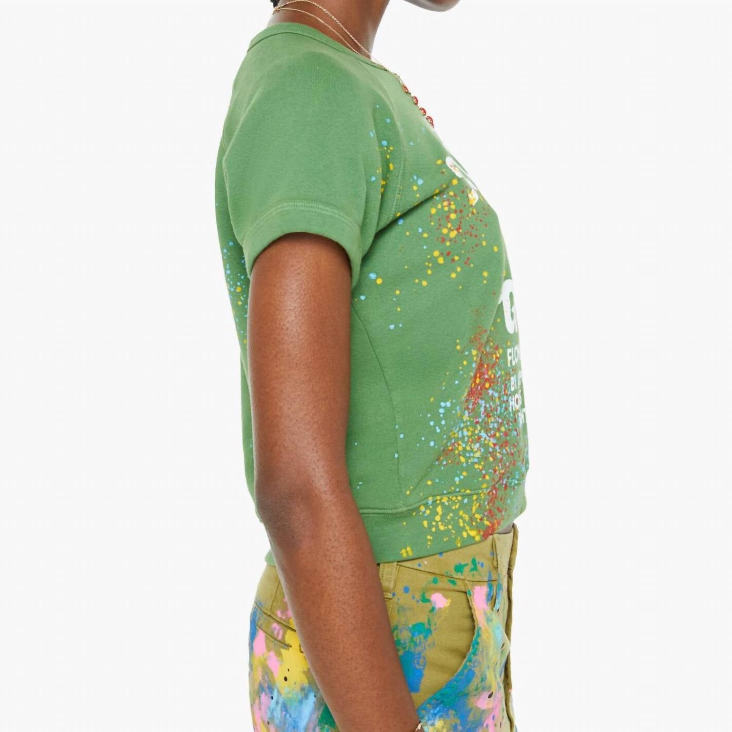 The short sleeve tee you'll want in every color. Introducing the Short Sleeve Concert Garden Tee by Mother, a standout piece for any green-inspired streetwear ensemble. This short-sleeve sweatshirt features a wide crewneck and offers a slightly shrunken fit, perfect for casual spring outings. Made entirely from 100% cotton, this tee showcases a vibrant green hue highlighted with white text, graphic flowers, butterflies, and artistic paint splatters. Easy to wear with its pull-on closure, it requires hand washing and should be laid flat to dry.