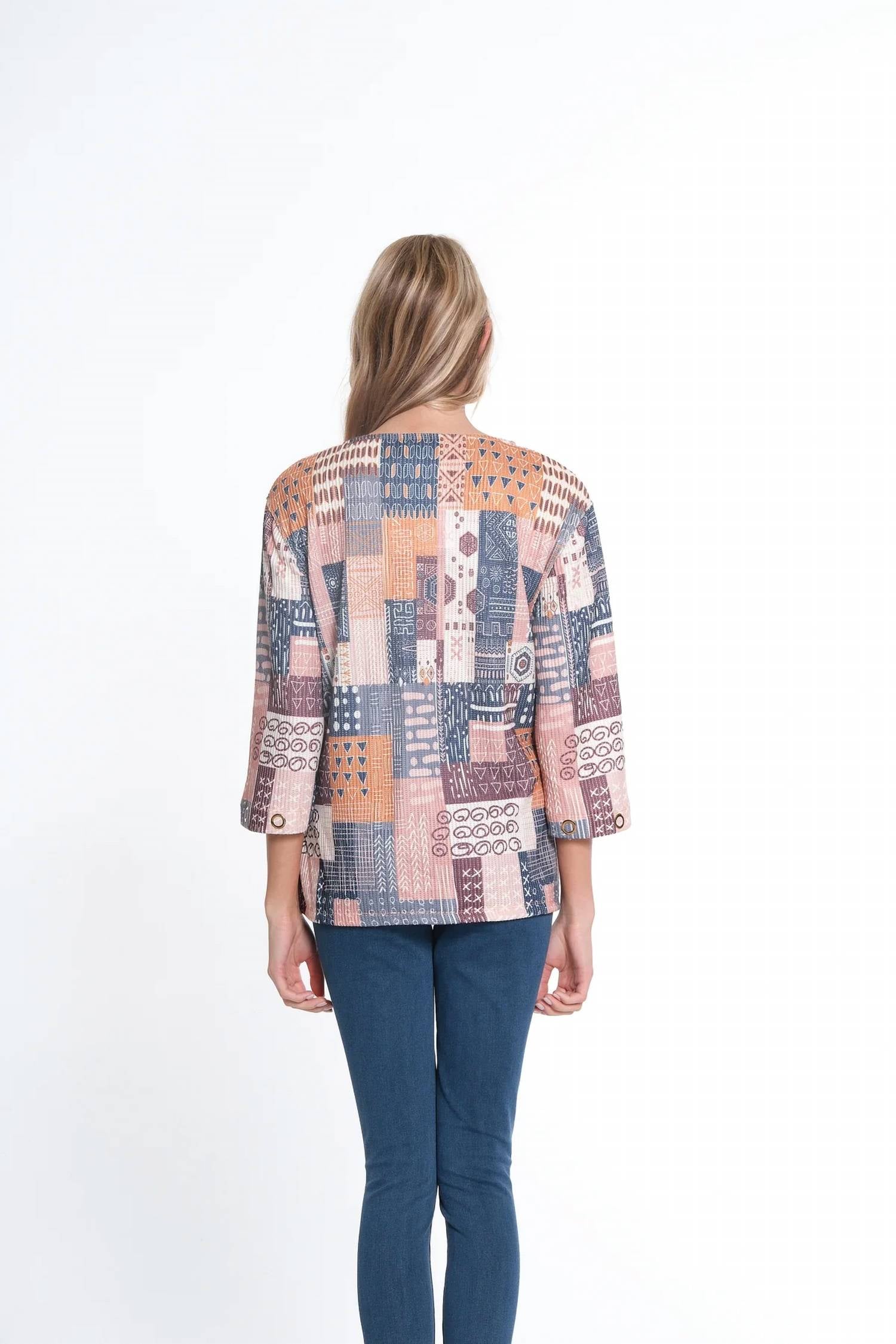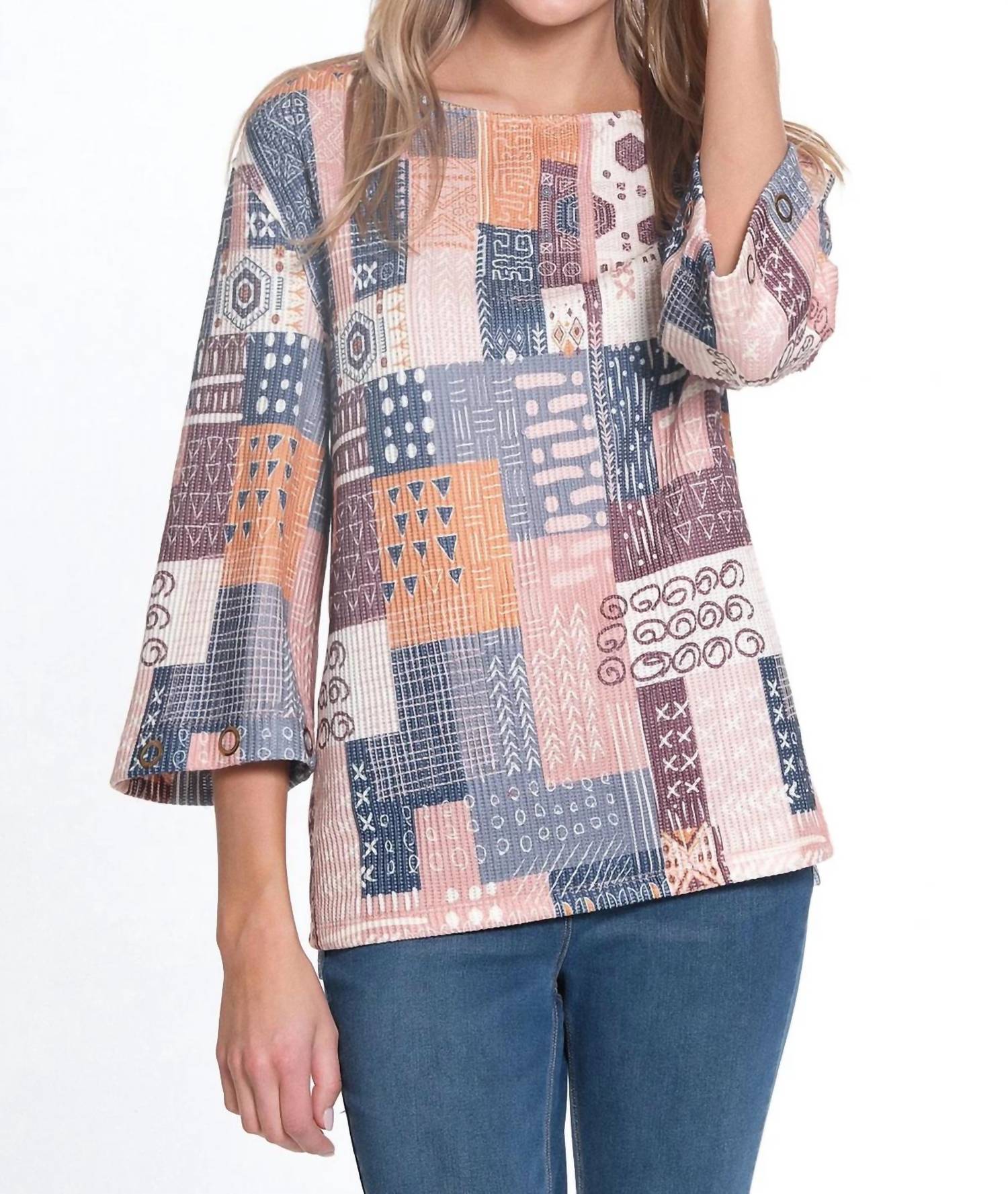 The perfect long sleeve tee that goes with just about anything. Showcasing a vibrant multi-colored pattern. Features three-quarter flare sleeves, a scoop neck, and a drop shoulder for added flair. Made from a blend of polyester and polyester spandex. Offers a comfortable, pull-on fit with a playful ring heatseal trim and patch print design.