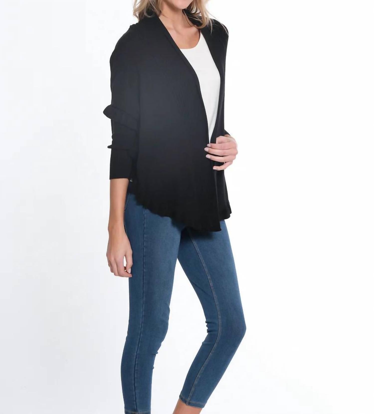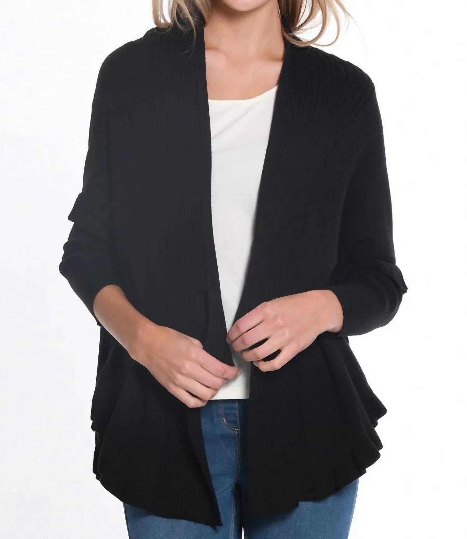 Throw this adorable cardigan over any cami or tank top. Introducing the Multiples 3/4 Sleeve Ruffle Hem Shawl Collar Sweater Cardigan in elegant black. This women's cardigan is crafted from a combination of rayon and nylon for a cozy and versatile addition to your wardrobe. With a shawl collar and three-quarter sleeves, it delivers effortless style with a solid pattern to suit various occasions. Enjoy the comfort and chic appeal without the need for closures.
