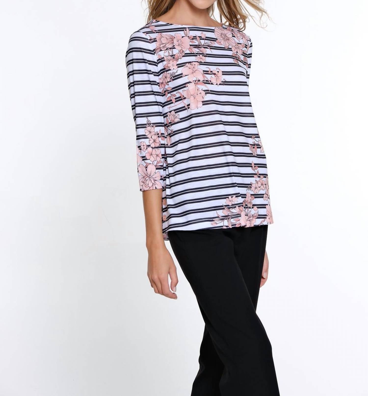 A timeless blouse that will never go out of style. Elevate your spring wardrobe with the Bateau Neck Top by Multiples, a striking piece adorned with a floral pattern in a vibrant multi-color palette. This blouse features three-quarter sleeves and a refined bateau neckline that enhances its sophisticated appeal. Crafted from a stretchy polyester-spandex blend, it ensures comfort and durability all day long. Closure: Pull on. Ideal for casual outings or brunch, this piece effortlessly blends comfort and style.