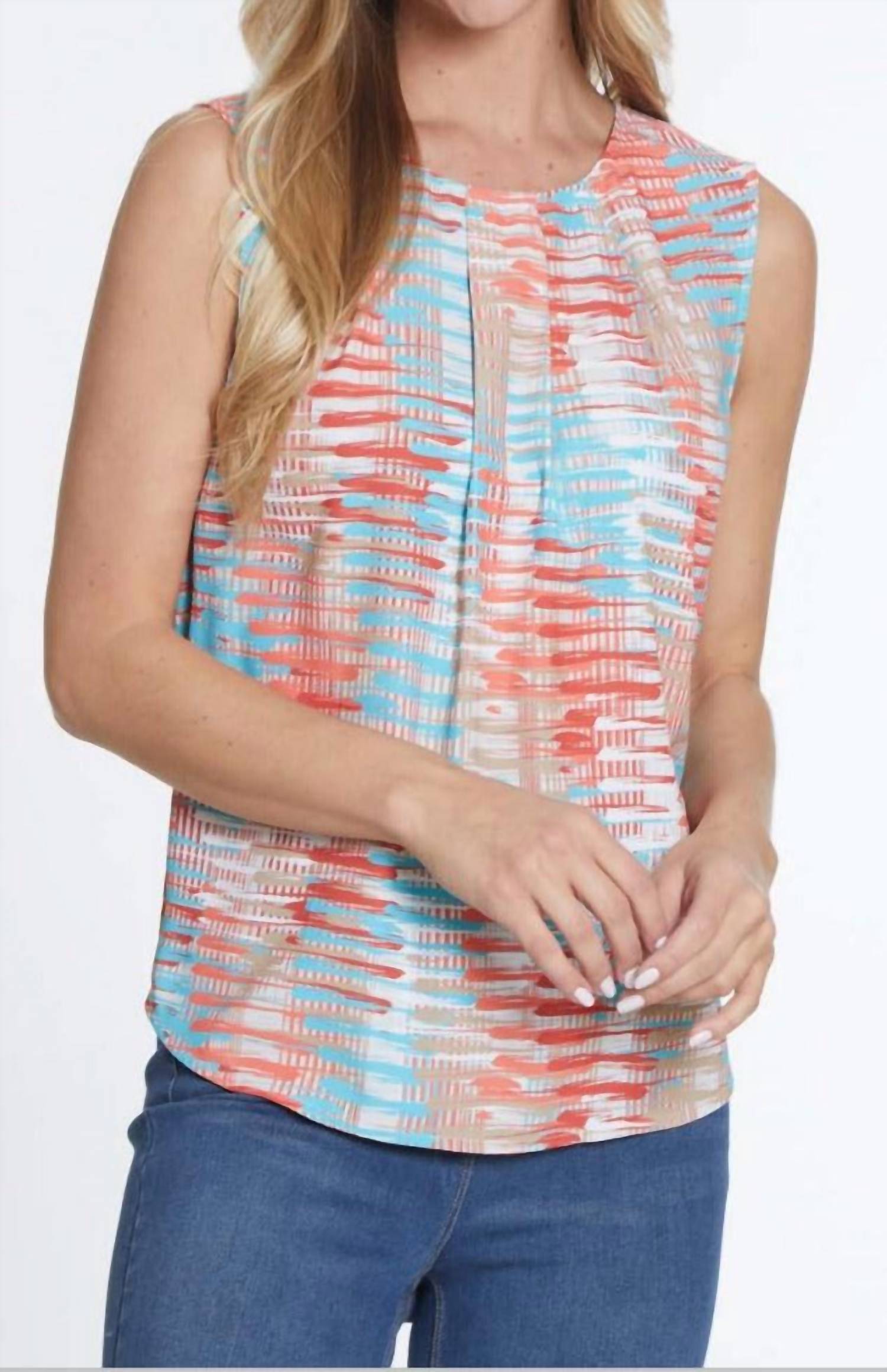 Fit, fabric and functionality. This tank top checks all the boxes. Introducing the Button Back Sleeveless Top by Multiples, an eye-catching tank in a vibrant multi colorway. This women's top features a textured pattern and a classic crewneck, perfect for adding variety to your wardrobe. Made with thoughtful design details, this piece has a unique button back for an elevated look. Note: Specific wash instructions and garment length details are not provided.