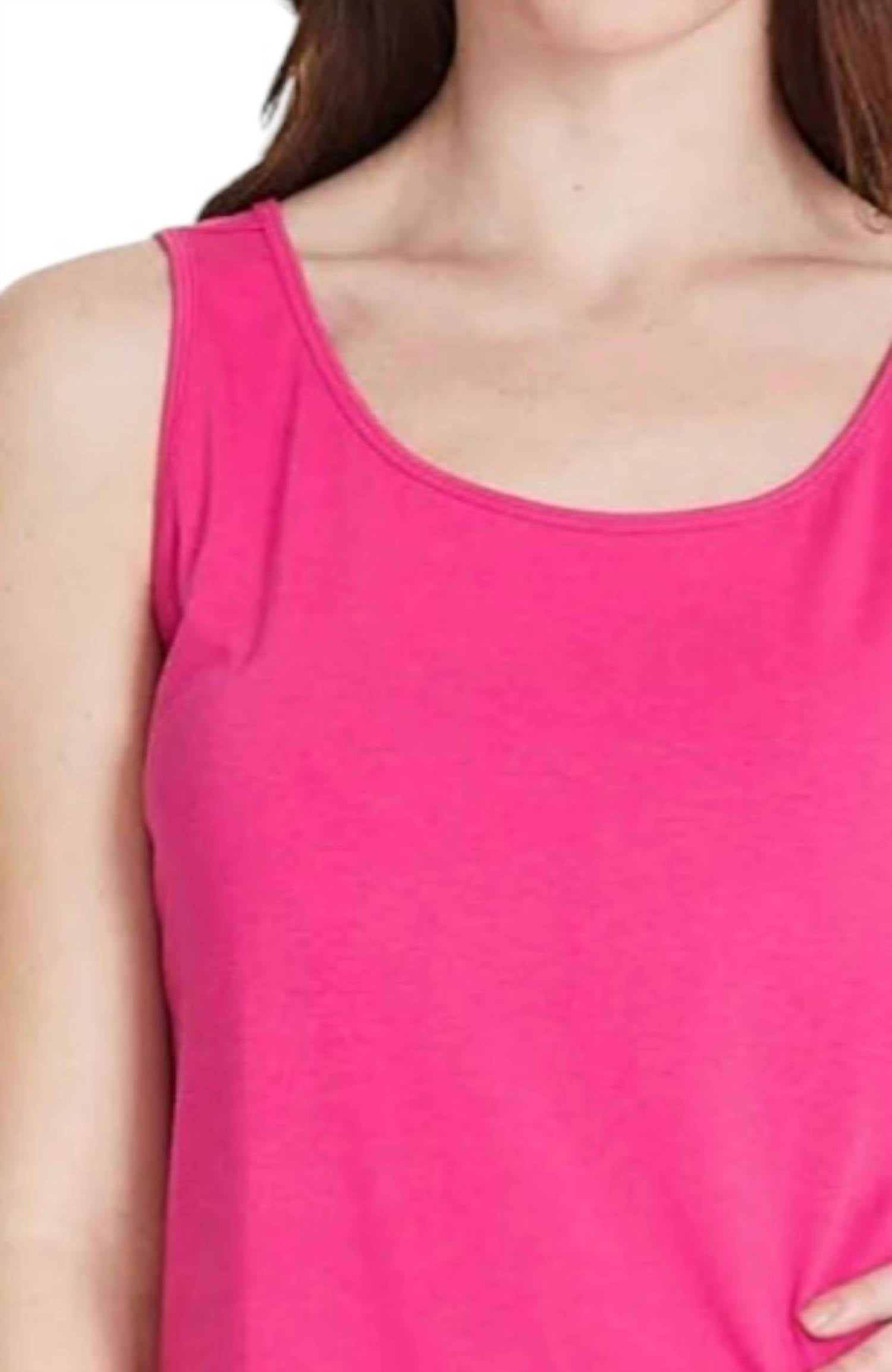Fit, fabric and functionality. This tank top checks all the boxes. Elevate your summer wardrobe with the Double Scoop Neck Tank Top by Multiples, crafted in a vibrant fuchsia hue perfect for vacation getaways. This sleeveless top boasts a luxurious cotton blend, comprising 57% Cotton, 39% Modal, and 5% Spandex, offering both comfort and style. Imported and featuring a fitted silhouette with a 25" length, it combines a scoop neckline and straight hemline with effortless pullover construction. Embrace a modern Y2K trend in a solid knit pattern, perfect for any sunny adventure.