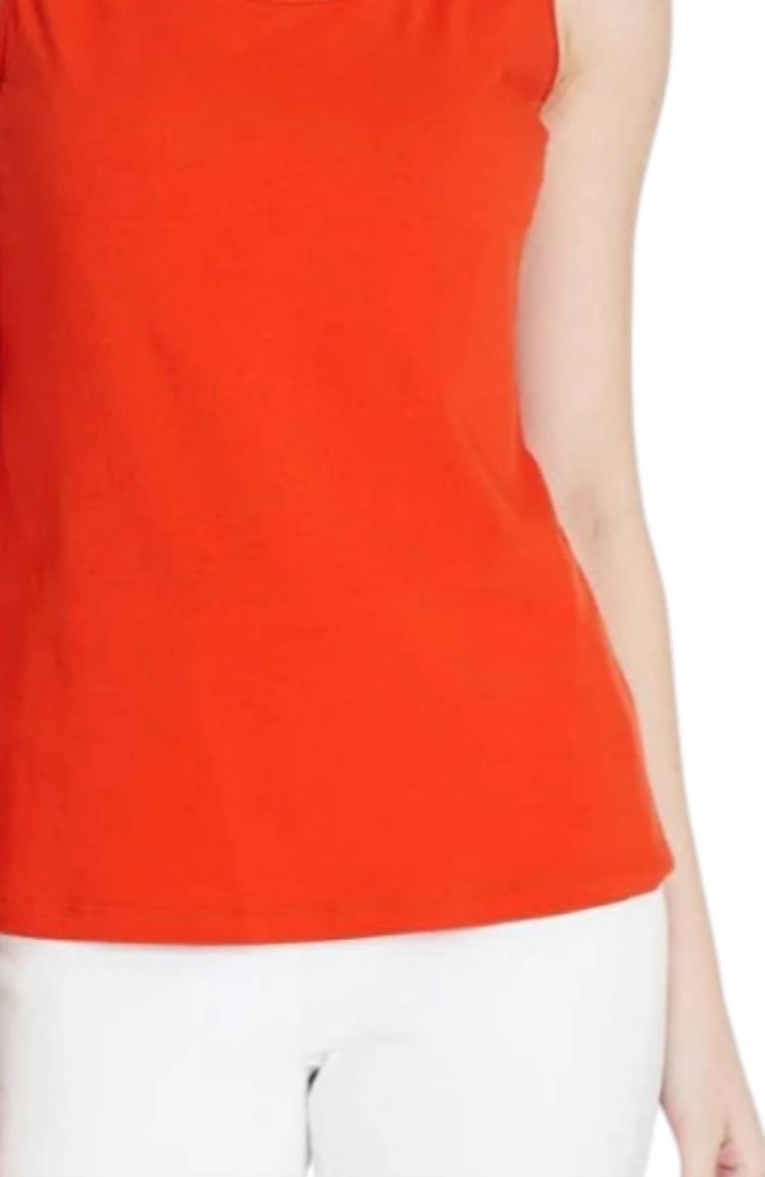 The perfect tank top for those warmer weather seasons. Elevate your summer style with the Double Scoop Neck Tank Top from Multiples, designed in a striking deep orange hue. This sleeveless top boasts a fitted silhouette with a solid knit fabrication and straight hemline for a clean finish. Crafted from a cotton blend of 57% cotton, 39% modal, and 5% spandex, it measures approximately 25" in length and features a convenient pullover construction. Perfect for vacation wear, this imported piece is tailored to capture the essence of the Y2k trend.