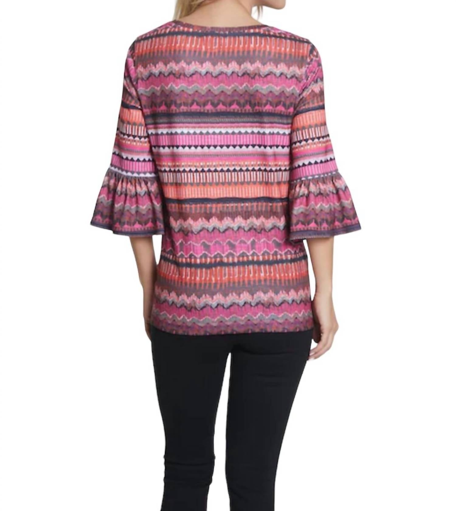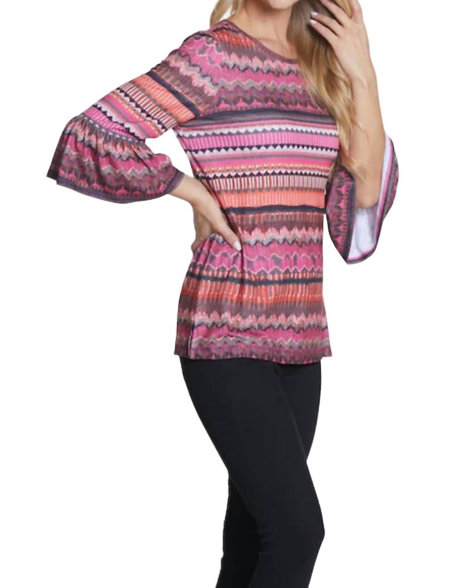 A versatile blouse that works from desk to dinner! Elevate your wardrobe with the Flounce Sleeve Chevron Print Top by Multiples in vibrant fuchsia. This blouse features stylish three-quarter flounce sleeves and a wide, elegant boatneck design. Crafted from a blend of polyester and spandex, this geometric patterned top offers a modern pull-on closure. Easy to care for, simply machine wash as needed.
