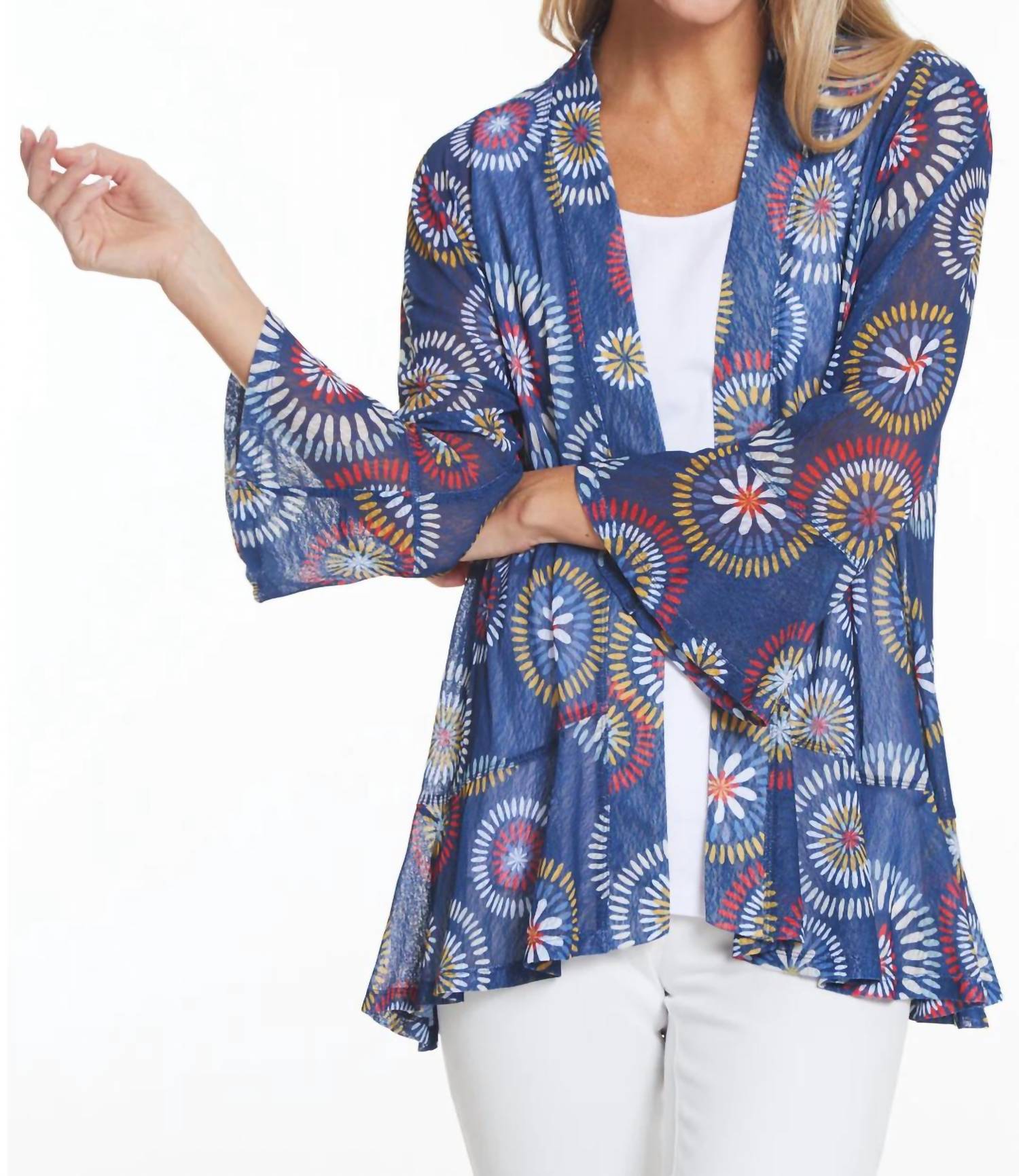 Introducing the Flounce Sleeve Mesh Open Cardigan by Multiples, a chic addition for any wardrobe. This cardigan showcases a striking onionskin print in navy, red, and gold, with three-quarter sleeves and a stylish open front. Crafted from a durable blend of polyester and spandex, the pull-on design offers ease and comfort. Care: Machine wash.