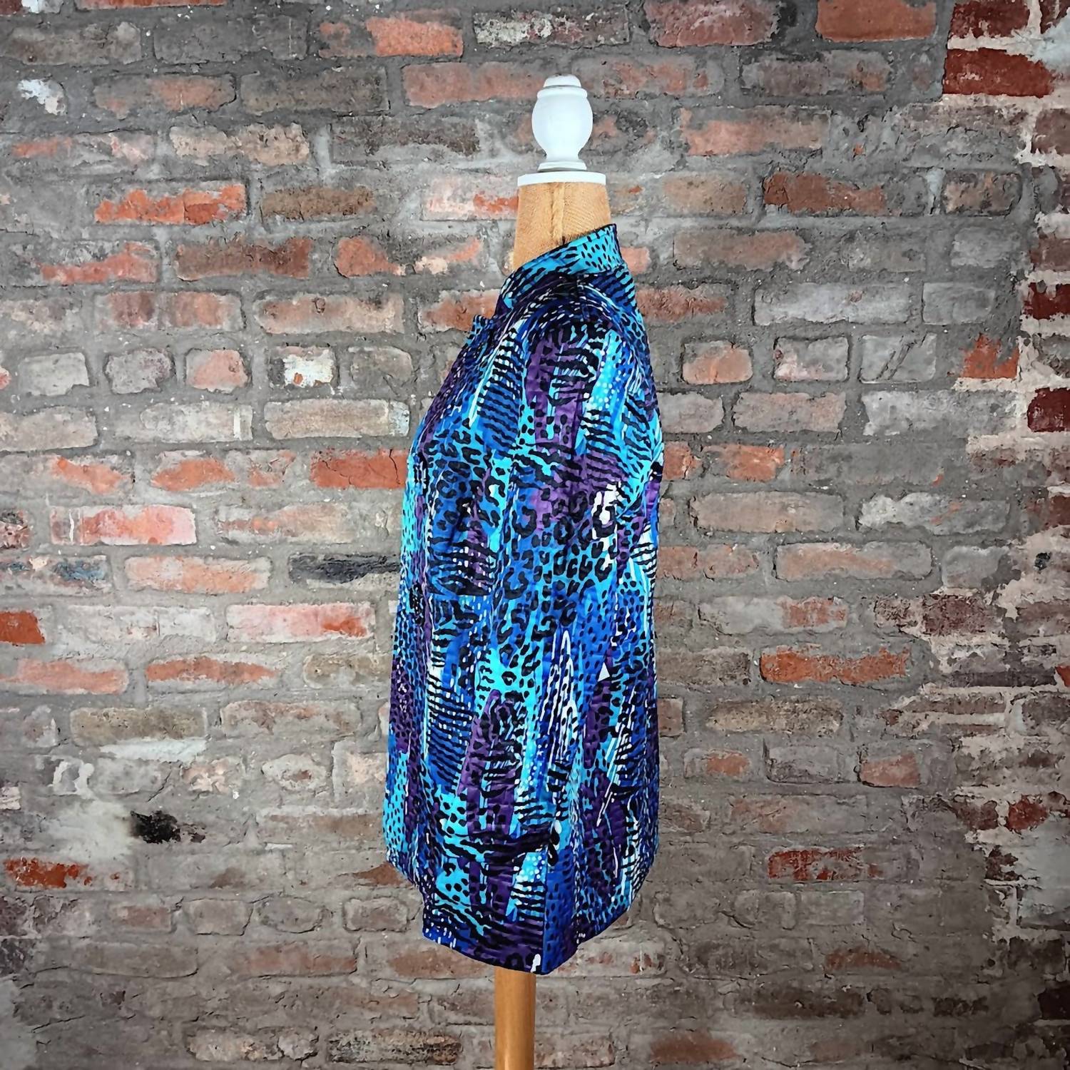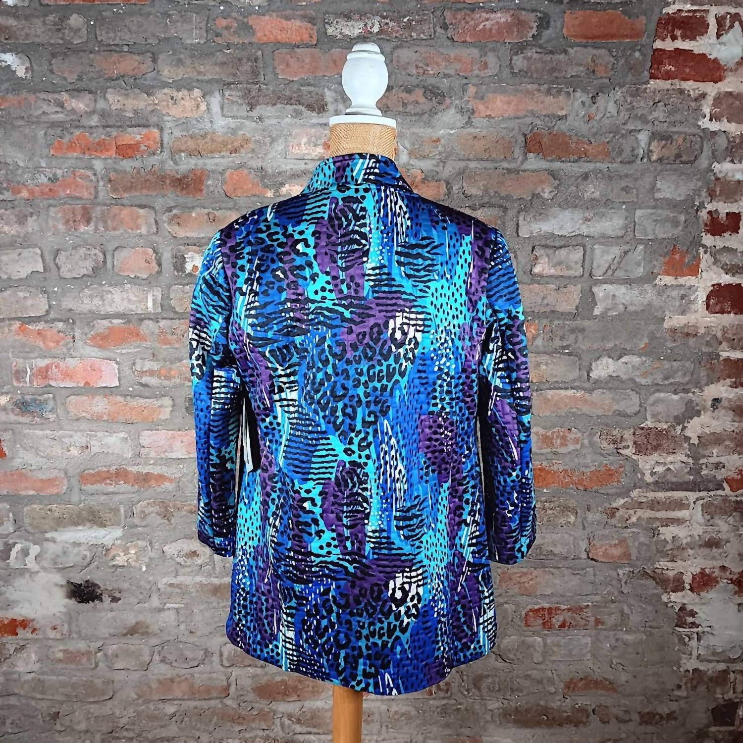 The Quarter Sleeve Stand Collar Quilted Jacket by Multiples is a stylish nod to 90s fashion, perfect for those spring adventures. Designed in a striking combination of teal, blue, and purple, this long-sleeve jacket offers warmth with its 100% polyester composition. Featuring a chic collar and large statement buttons, it combines both function and style effortlessly. Care instructions: Hand wash to maintain its vibrant colors and quilted texture.