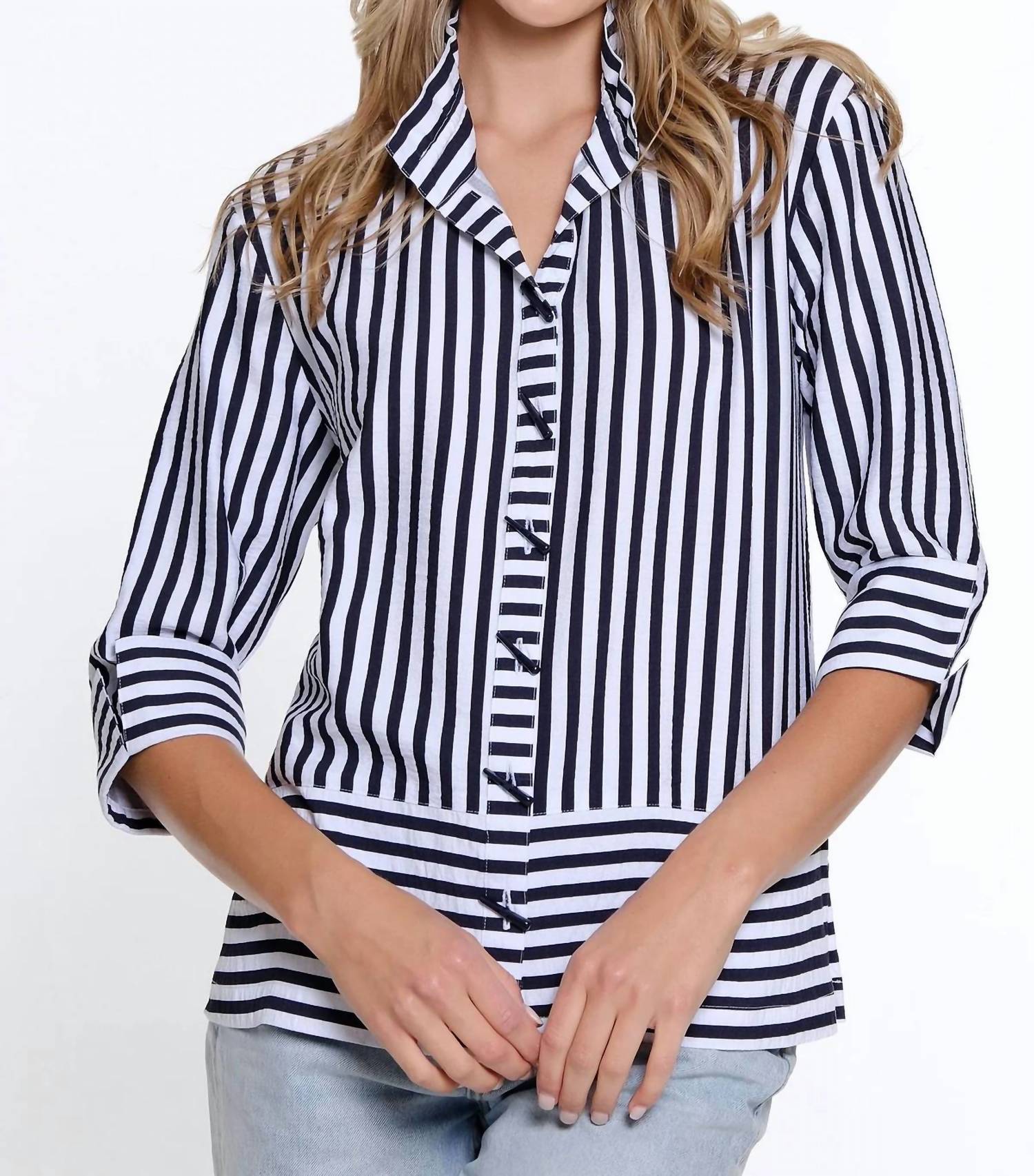 A timeless blouse that will never go out of style. Elevate your wardrobe with the Multiples Wire Collar Button Front Blouse in a classic navy stripe. This blouse features three-quarter sleeves with turn-up cuffs and a wire collar for adjustable styling. Made from a lightweight rayon-nylon blend, it ensures breathable comfort and a polished look. Closure: Button front.
