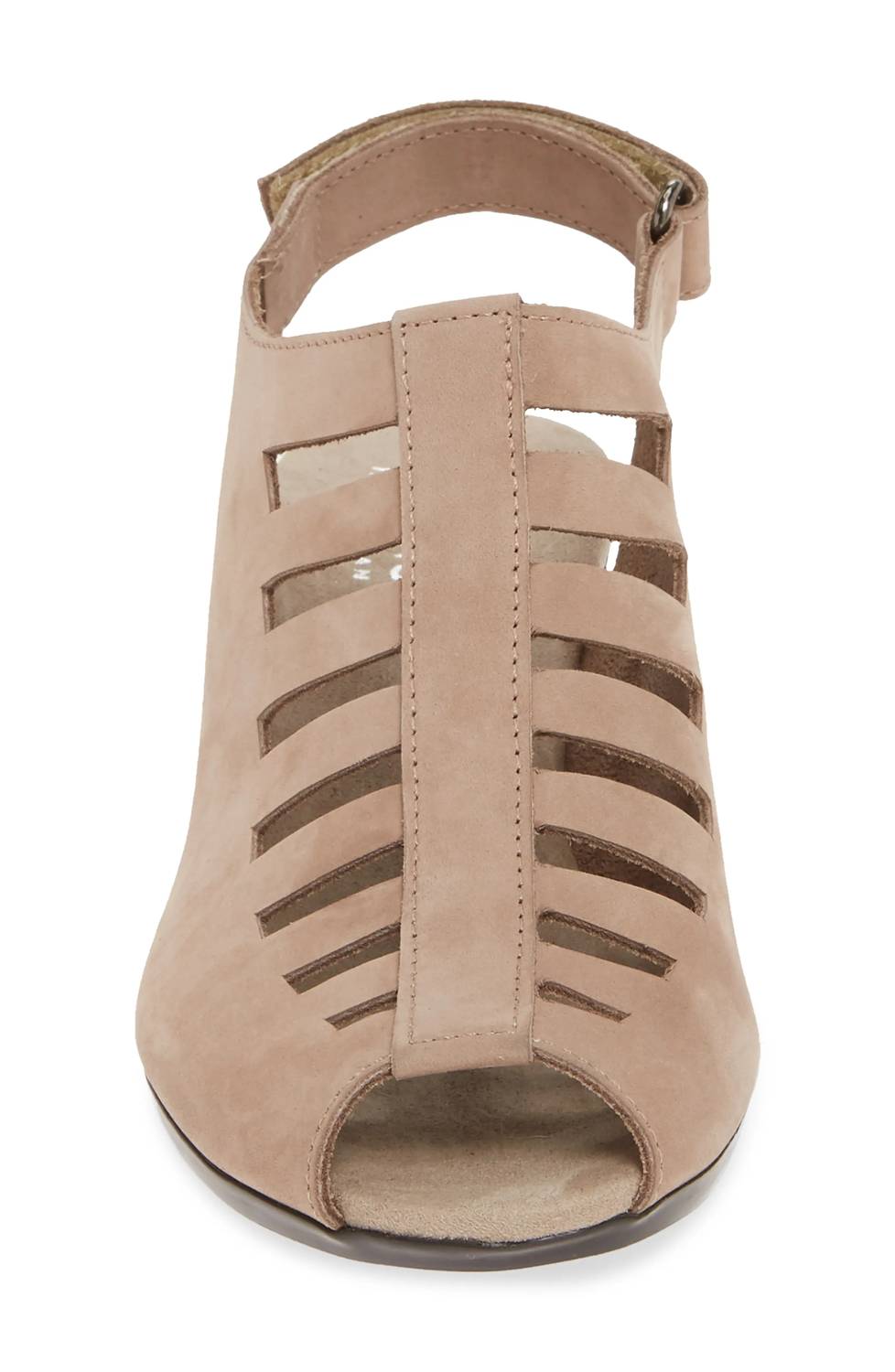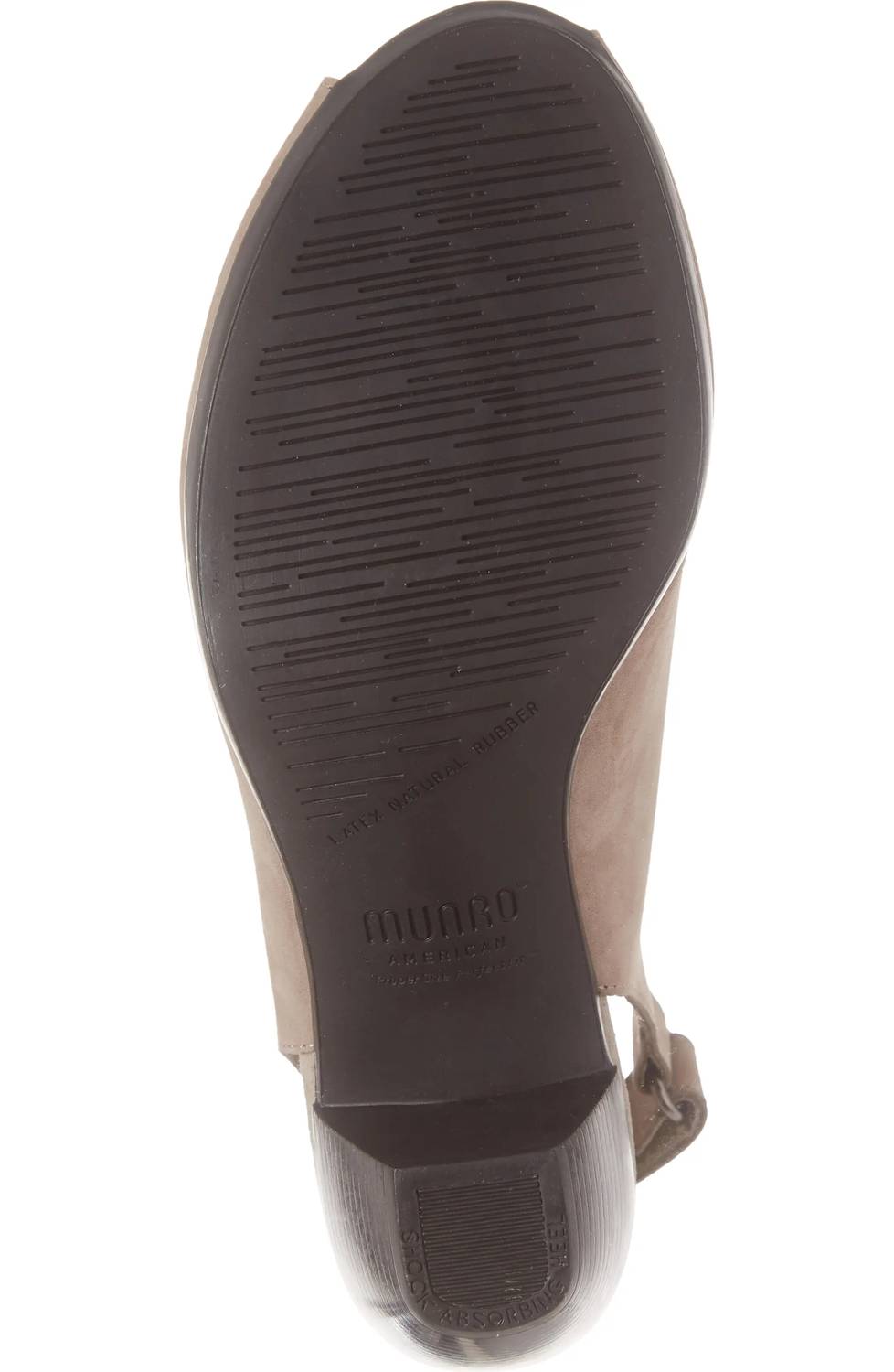 This sandal will take you from brunch to dinner and everything in between. Meet the Abby Sandal by Munro, an elegant choice for women in taupe nubuck leather. This mid-height (2 1/2") block heel features a peep toe design and an adjustable strap with buckle closure, ensuring a comfortable and personalized fit. The sandal provides exceptional comfort with its shock-absorbent, flexible, and slip-resistant properties, plus a riveted steel shank for ultimate support. Crafted with a leather upper, textile lining, and rubber sole, its molded insole with PORON® flex zone promises long-lasting wear, though a slight dye transfer may occur with darker colors initially.