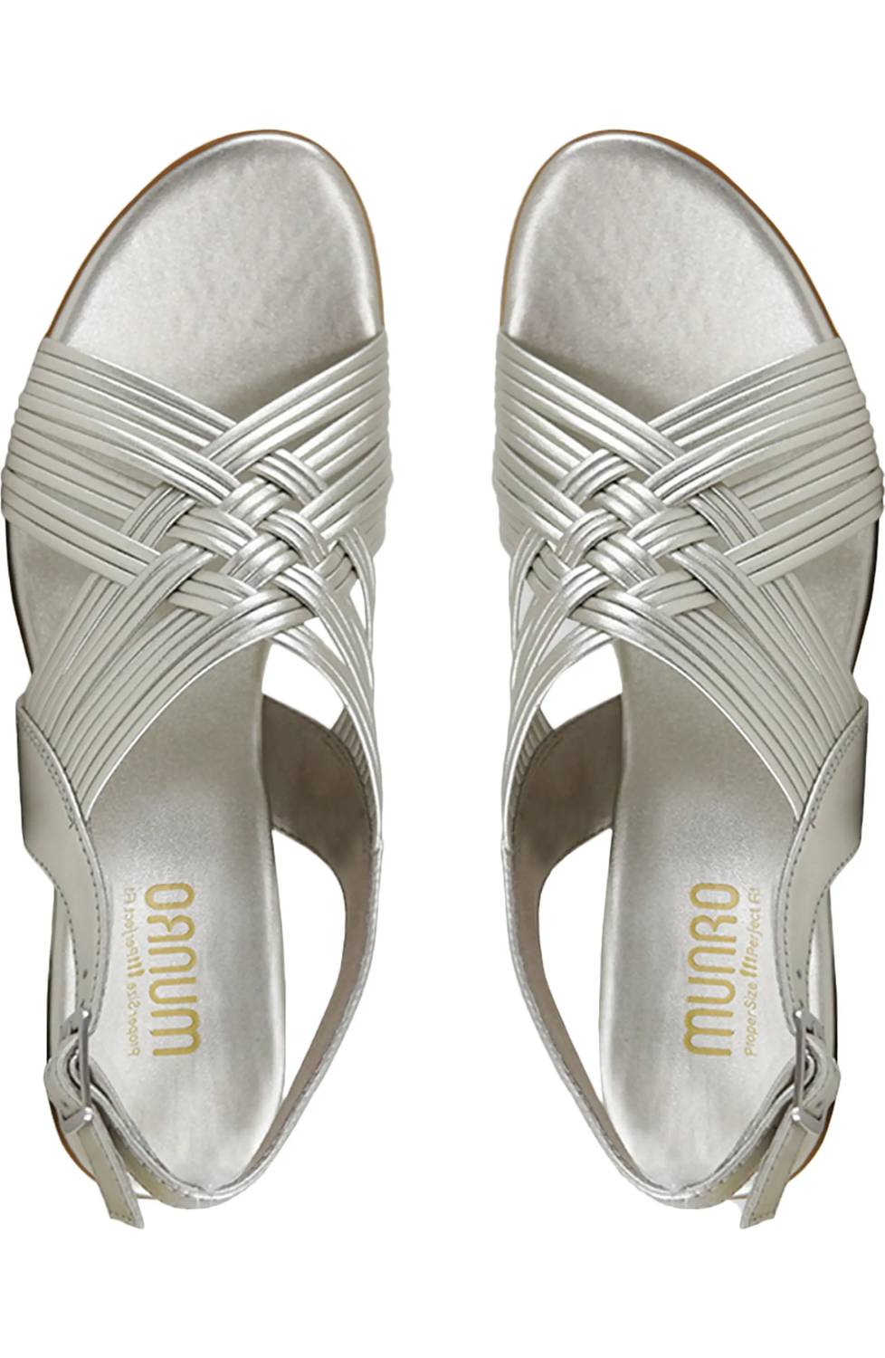 Classicly cute and all-day-wearable. We love this sandal. Discover the Munro Marianna Slingback Sandal in Metallic Leather, a sophisticated addition to any wardrobe. These women's sandals boast an almond open-toe design with a chic criss-cross strappy style and feminine kitten heels measuring 2.25 inches. Made with a high-quality leather upper and insole, they feature a backstrap with a buckle closure for a personalized fit. The flexible rubber outsole and leawood insert at the heel ensure both durability and timeless elegance.