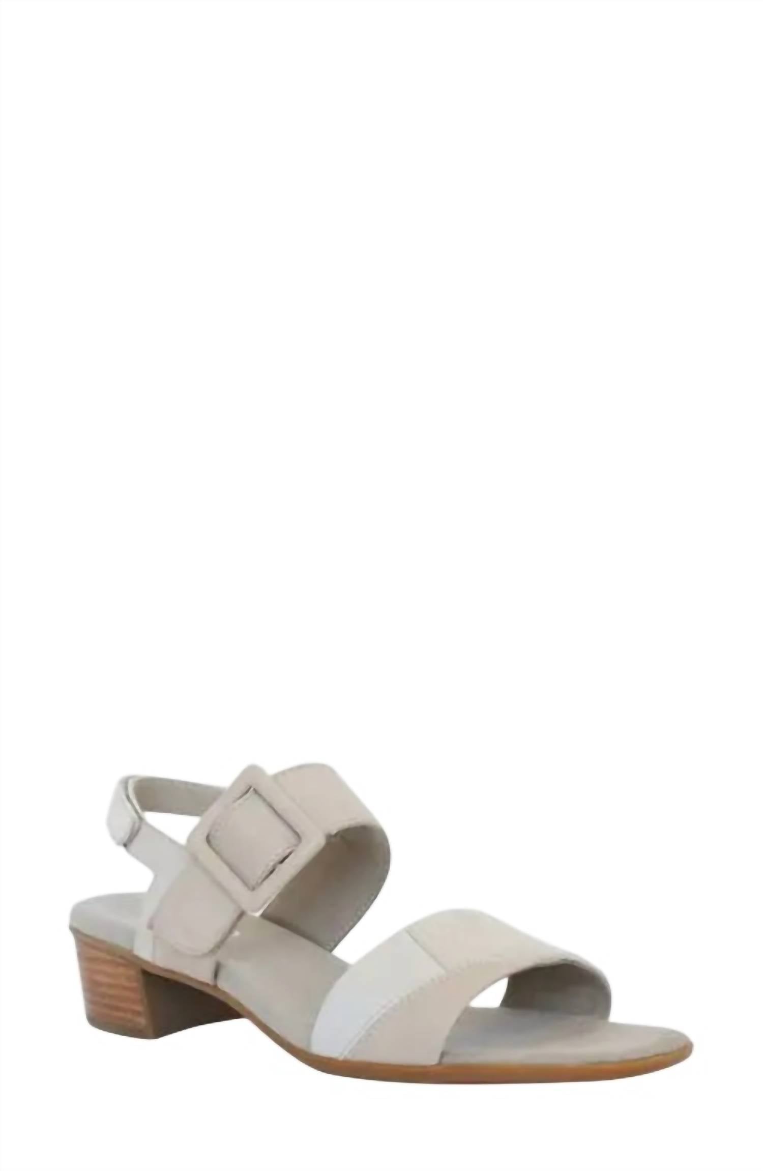 Flowy dresses, cropped pants, and even jumpsuits... this sandal works with them all! Step out in style with the Women's Frances Slingback Sandal by Munro, designed for a chic boardwalk stroll. Featuring a unique mid taupe combo and color-blocked straps for a mod look, these sandals boast a retro rectangular buckle and a cool wood insert at the heel. Made with a leather upper and lining, and supported by a sturdy rubber sole, they offer durability and comfort. Assembled in the USA from imported materials, they showcase an open toe and 1.5-inch block heel for a sophisticated, low-profile lift.