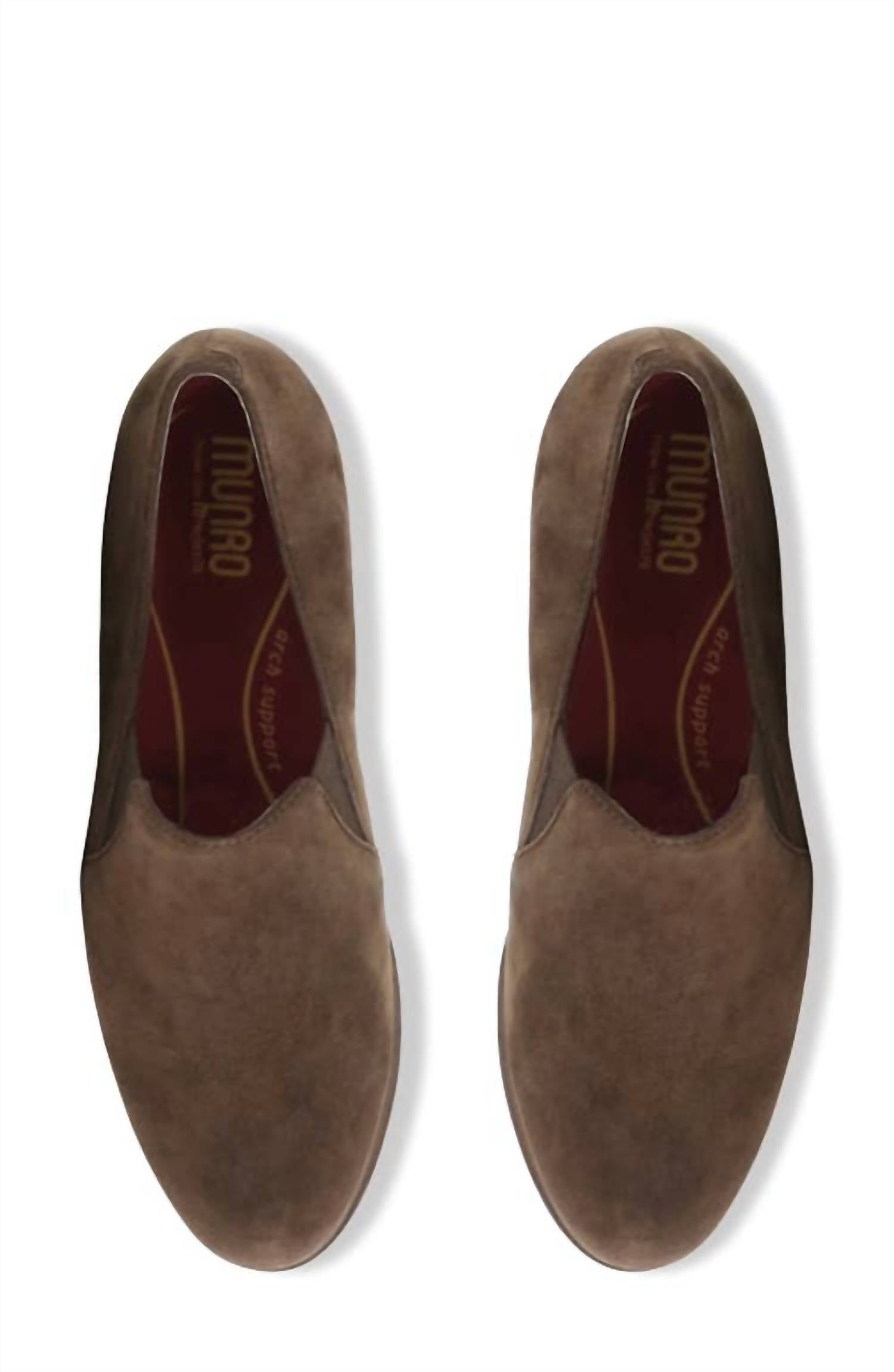 A preppy yet feminine take on the classic loafer. Step into comfort and style with the Women's Kam Loafer by Munro, crafted in elegant brown suede. This loafer features a smart round toe design with elastic insets for easy wear and a contoured cushioned insole with arch support for all-day comfort. The upper is made of a quality blend of leather and textile, complemented by a synthetic lining and sole. These loafers promise both durability and timeless appeal. Imported.