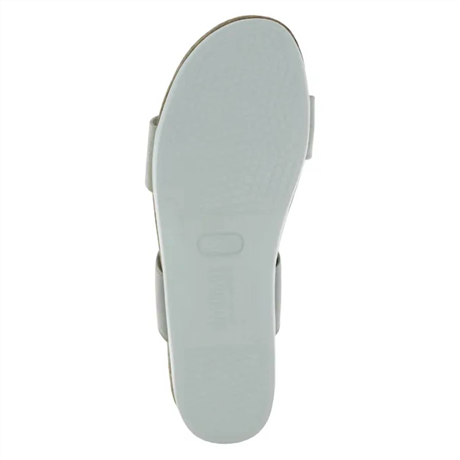 Discover the Women's Pisces Elastic Sandal by Munro, perfect for your next vacation. This American-made slingback sandal in white and grey features a slip-on closure and an open toe design. The upper is crafted with stretch fabric, while the durable cork and latex outsole ensures support and shock absorption. With a heel height of 0.5 inches, it offers excellent arch support and comfort thanks to the non-removable cork footbed and breathable microfiber lining.