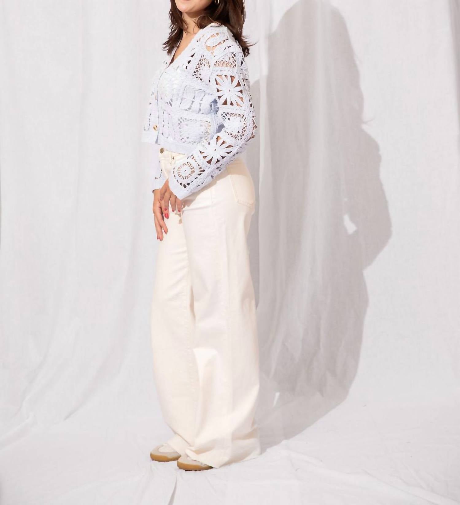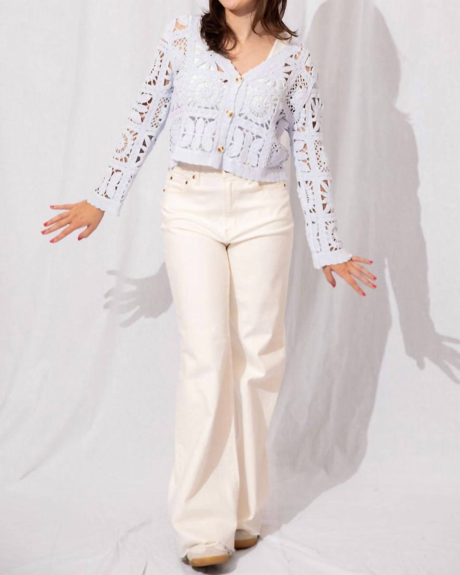 A classic fit that works just as good buttoned as it does left open. Meet the Sunny Days Crochet Cardigan by Mystree, an enchanting piece that adds a touch of boho chic to your summer wardrobe. With its long sleeves and delicate open-knit pattern, this cardigan is crafted from 100% cotton, making it incredibly breathable. Designed in a captivating blue color, it features a V-neck and button closure, perfect for effortless layering over your favorite outfits. Care is simple with machine wash and line dry instructions, ensuring it remains a staple for vacations, beach walks, and more.
