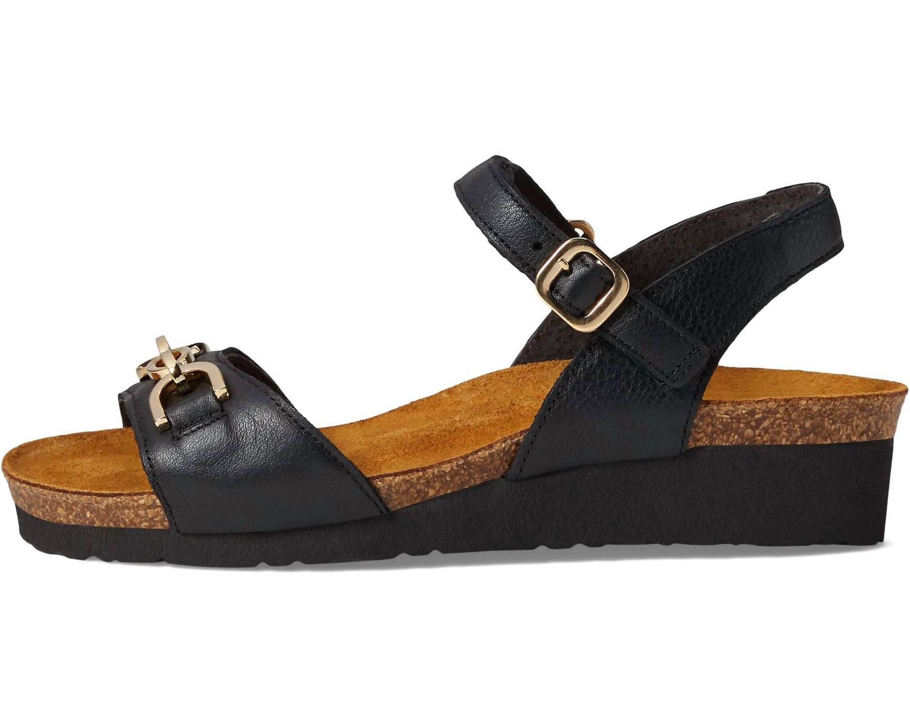 This Aubrey is an elegant sandal with gold tone chain strap accent. Features hook & loop strap at the instep and a backstrap. Anatomic cork & latex footbed. Fit: True to size, half sizes should size up. Sole Material: EVA. Heel Height: 1.5 ", Width: Narrow to Medium, Platform Height: .5 ". Slip Resistant: No. Orthotic Friendly: No. Removable Footbed: No