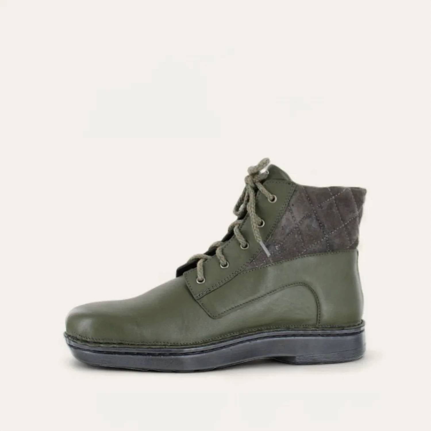 Say hello to the perfect, most versatile boot. The ankle height makes this style easily transition from day to night. Wear them with your favorite skinny jeans and tee for a more laid back look, or pair them with your favorite mini dress and jacket for a night out on the town. Experience ultimate comfort in a unique soft green/gray. Made from premium leather. Featuring a lace-up closure with a zipper accent, this bootie showcases quilted details for an added touch of sophistication. Walk confidently on the 1.25" heel and wide, slip-resistant polyurethane sole that accommodates orthotics with its removable Utopia footbed. Embrace the foot-health benefits of Naot's anatomic cork and latex footbed, endorsed by the American Podiatric Medical Association for its supportive round toe design.