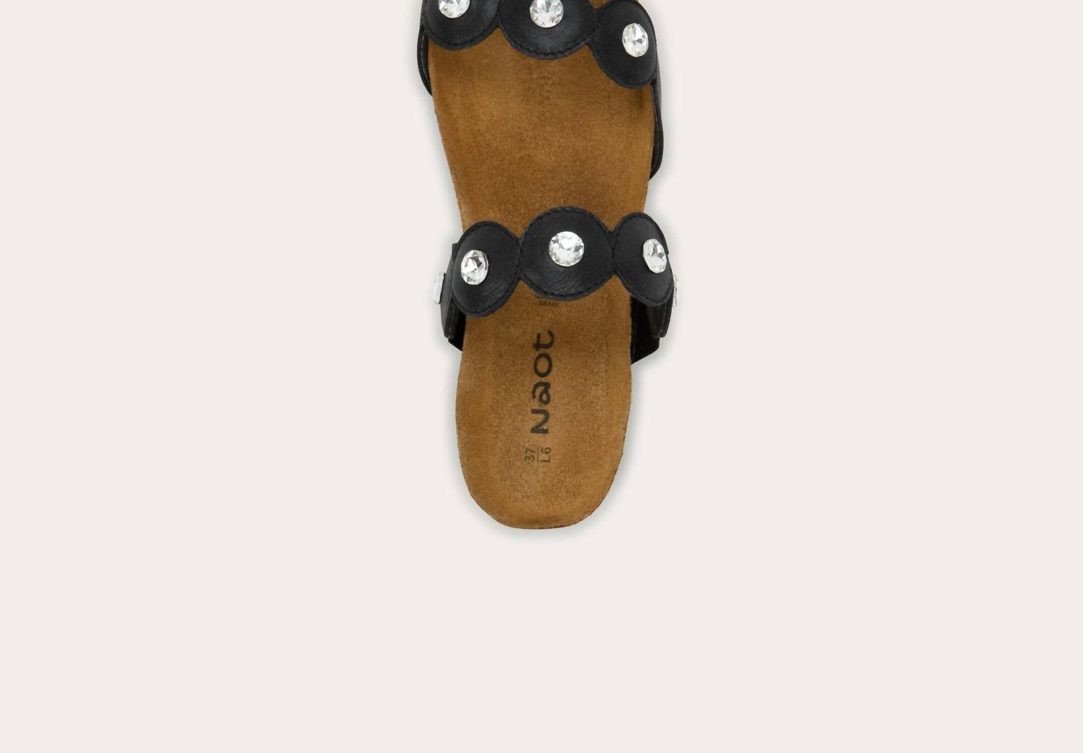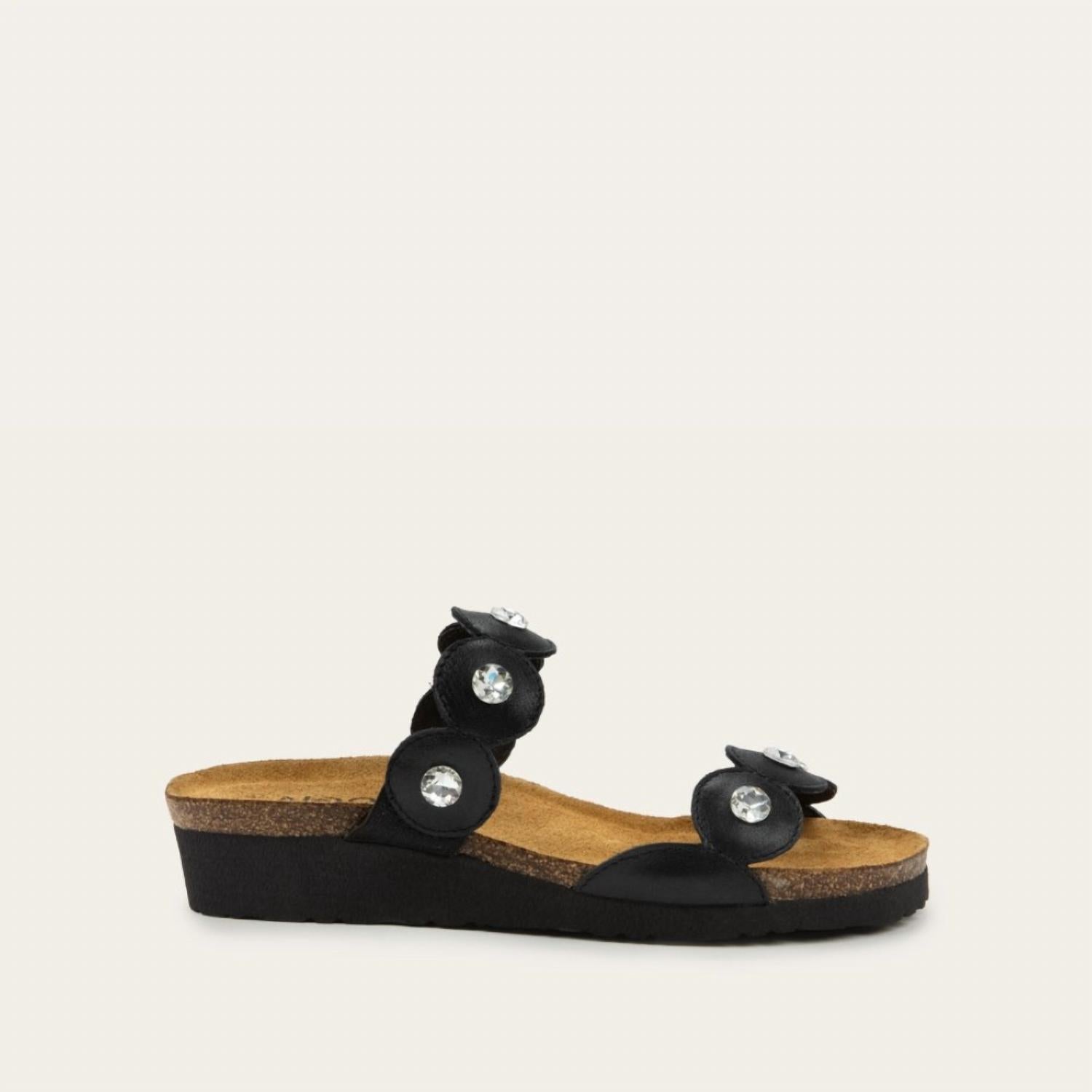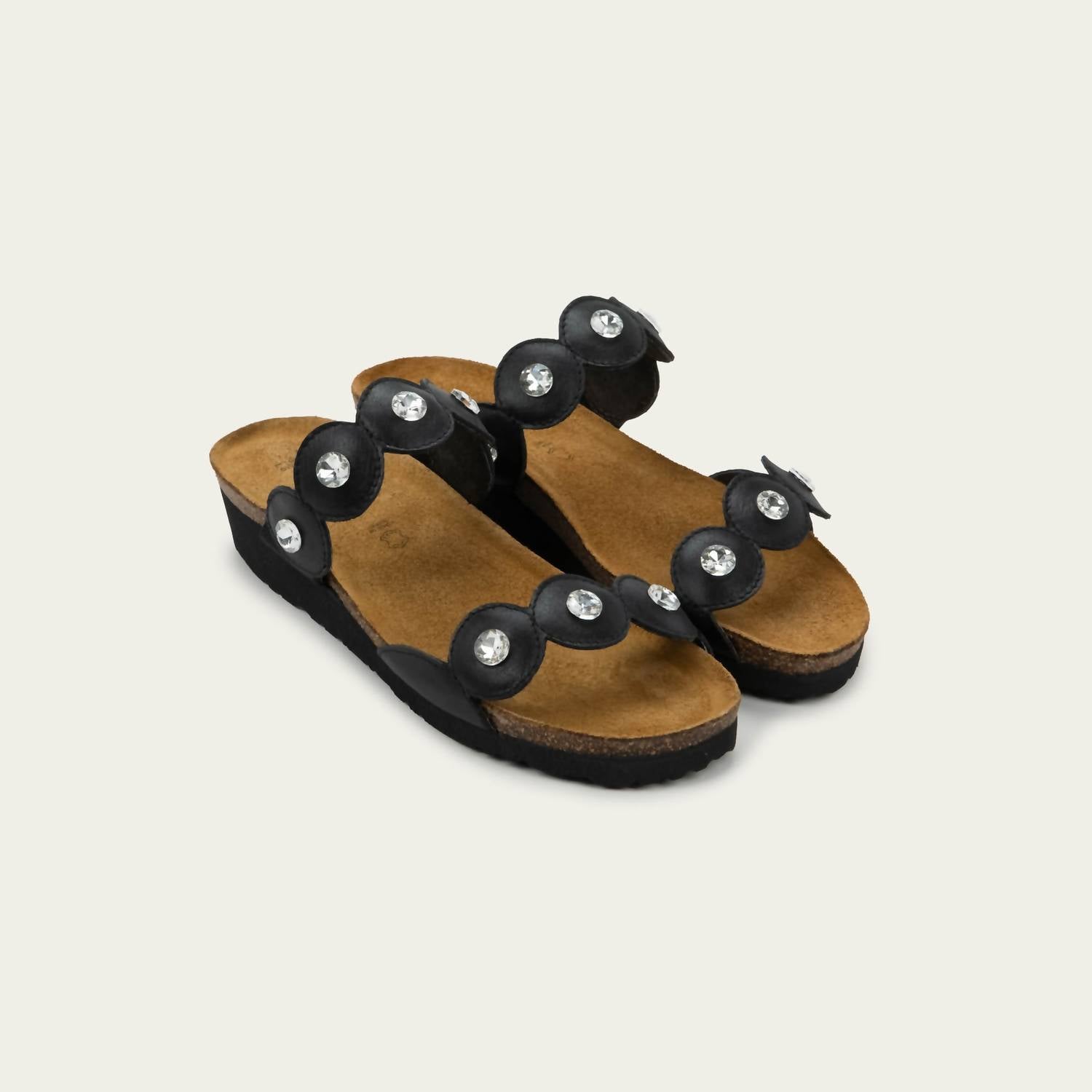 Classicly cute and all-day-wearable. We love this sandal. This sandal is a comfy and stylish slide with sparkly rhinestones. It’s easy to slip on and fits nicely thanks to stretchy sides. The soft footbed shapes to your foot for all-day comfort, and it’s made to support healthy feet. The sole is about 1.5 inches high, giving you a little lift without hurting your feet.