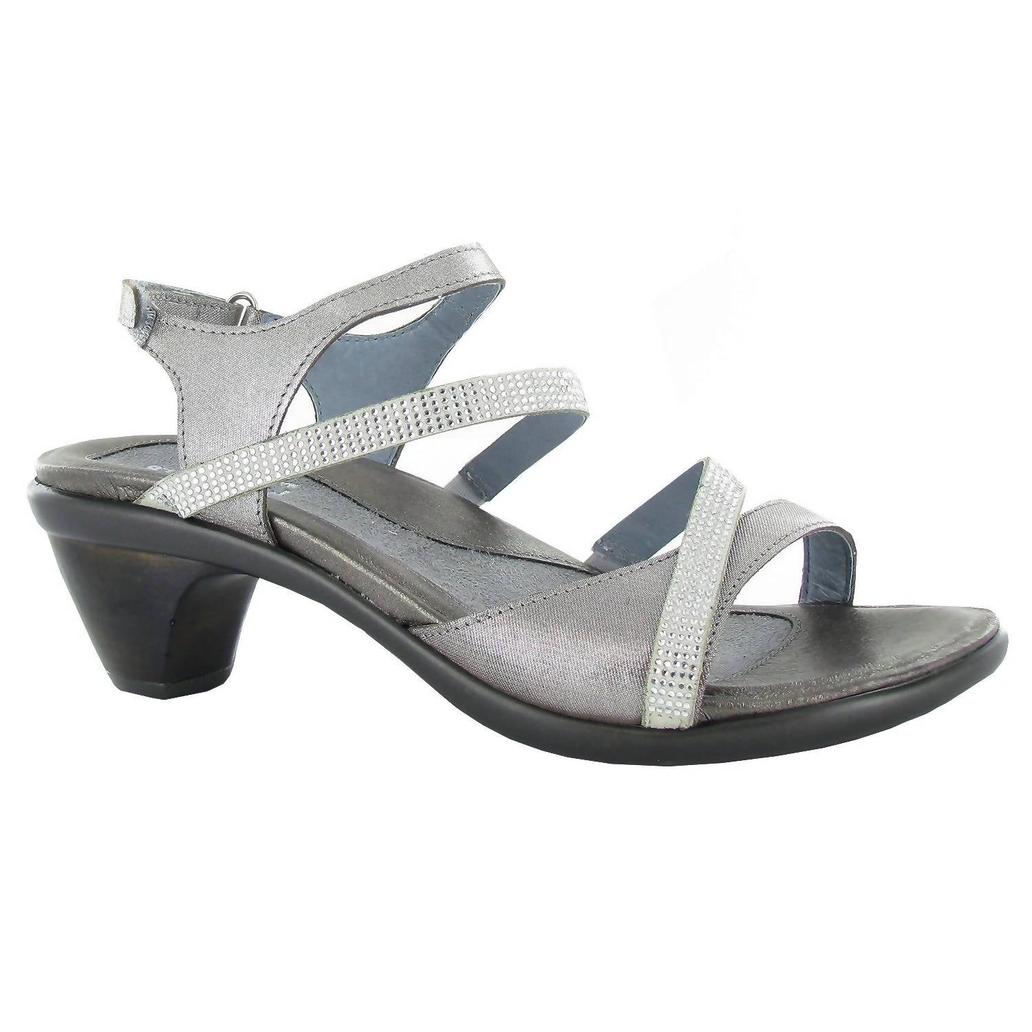 Step into elegance with the Women's Innovate Heels by NAOT, a sophisticated choice for holiday parties in stylish Nzq Silver Thread. These backstrap heels captivate with rhinestone accents and a custom fit, thanks to the hook and loop adjustment and middle strap with gore. The rubber TPR sole, complemented by a metal shank, offers a comfortable 2" block heel that exudes height without compromising on ease. Perfect for minimalist spring ensembles, this heel features a cork and latex footbed wrapped in leather for ultimate comfort.