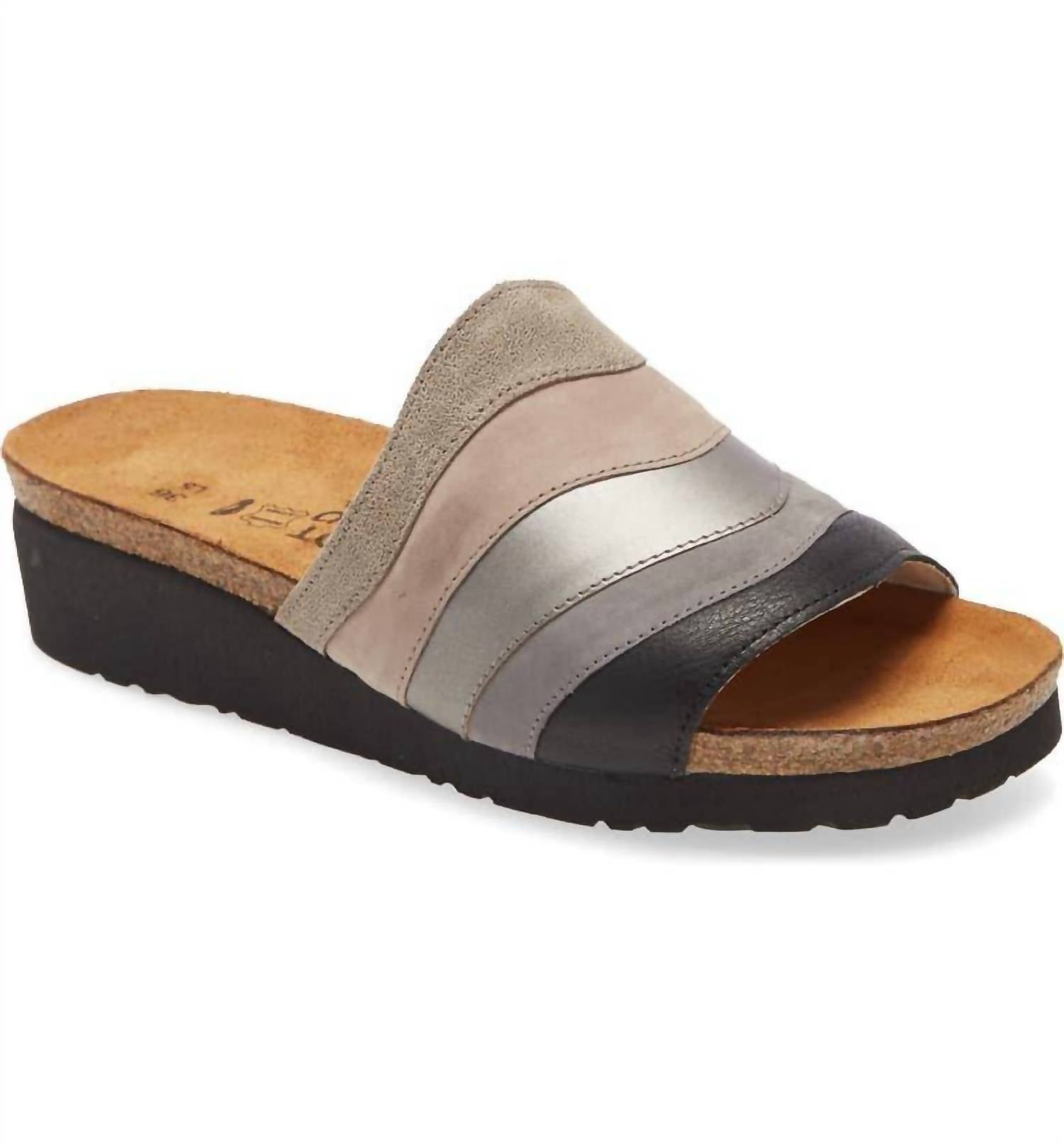 Dresses, denim, shorts... these wedges go with just about anything. Step into summer with the Women's Portia Wedge Sandal by NAOT, featuring a captivating multicolored vamp with a flicker of metallic leather. These wedge sandals boast a supportive molded footbed, ensuring comfort and ease with every step. Perfect for a minimalist vacation vibe, they arrive in a stylish beige, stone, and grey colorway. Ideal for warm weather with an open toe design, these sandals effortlessly blend fashion and function.
