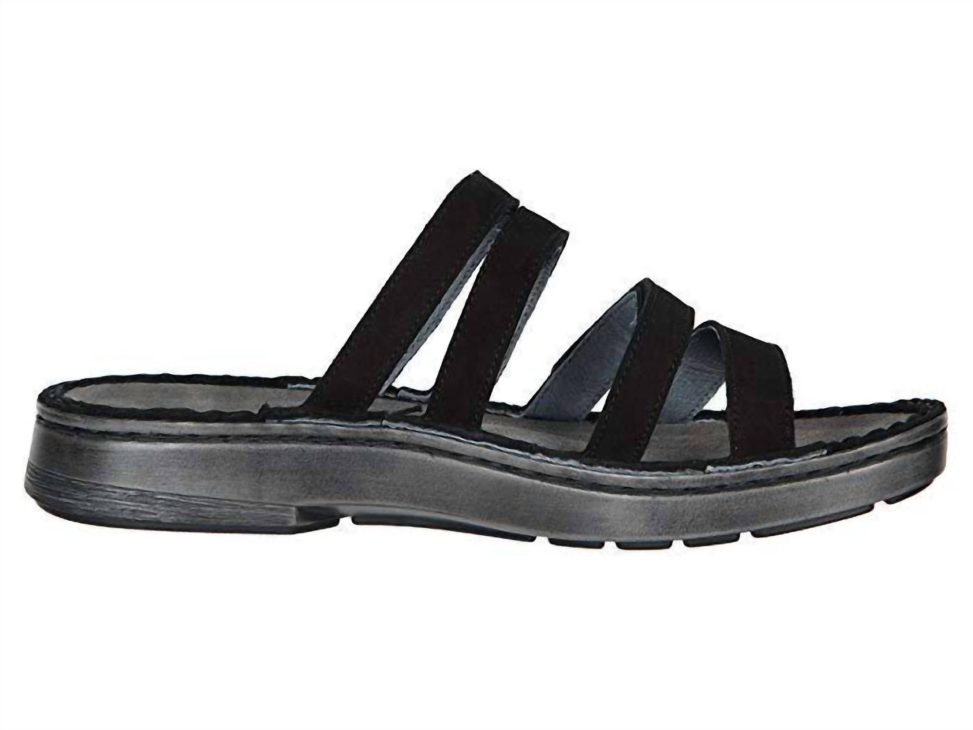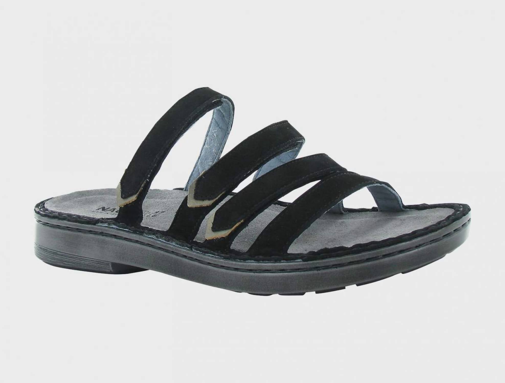 Flowy dresses, cropped pants, and even jumpsuits... this sandal works with them all! Step into summer sophistication with the NAOT Women's Trevi Slip-on Sandal, a minimalist design perfect for any dinner party. Crafted from elegant black leather, these sandals feature an open toe and a flash of metallic leather at the straps. Designed with a flat heel and medium width, they ensure comfort during adventures at home or away. Ideal for lightweight elegance this summer.