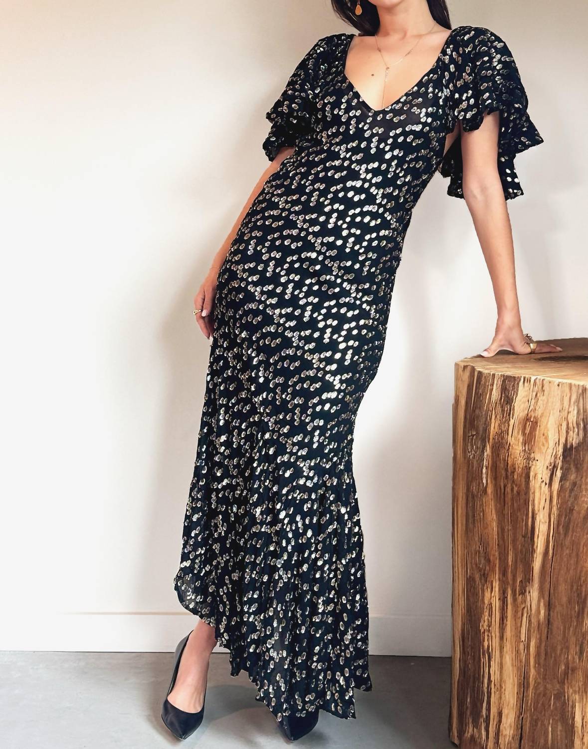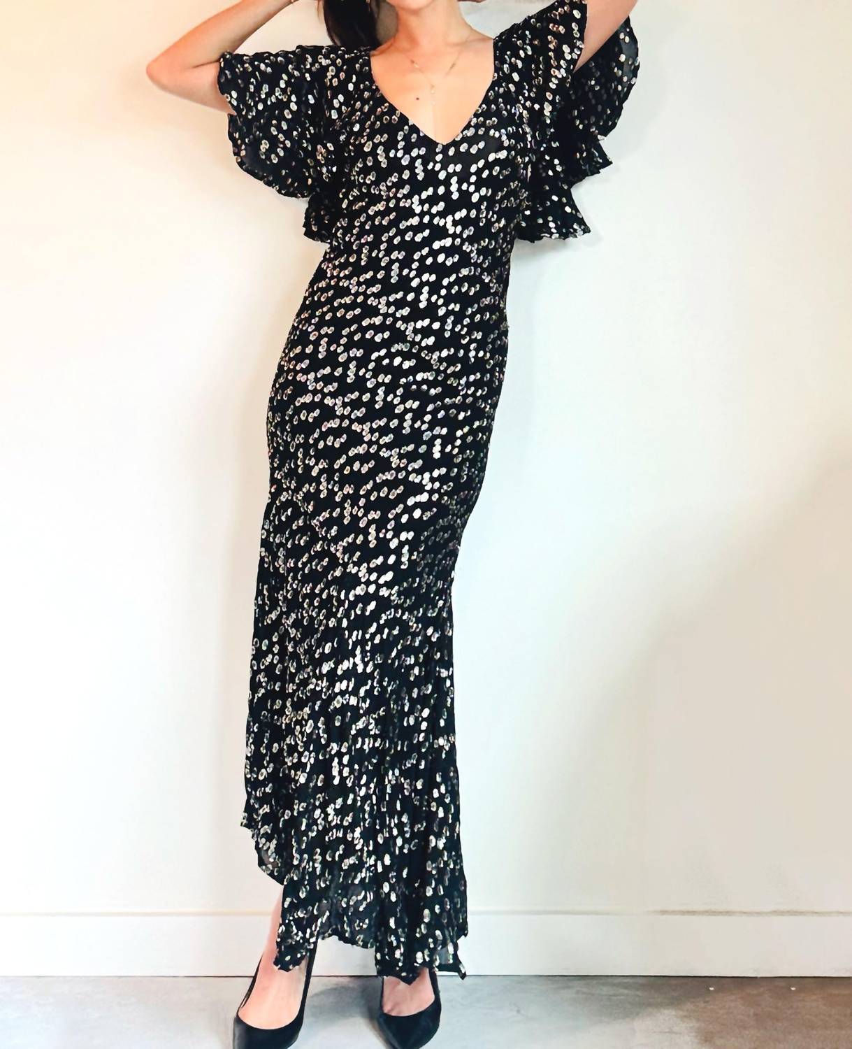 Style this maxi with your favorite statement necklace and sandals for the perfect look. Introducing the Ramya Maxi Dress by Natalie Martin, an exquisite piece for any evening event, especially perfect for New Year's Eve. This dress features a v-neckline and elegant double-flutter short sleeves, crafted from metallic chiffon that exhibits a subtle sheen with its patterned design. The sheath silhouette is fitted from the bust down, flaring gently at the ankle, adding a touch of quiet luxury to your wardrobe. Crafted with a pull-on closure for easy wear.