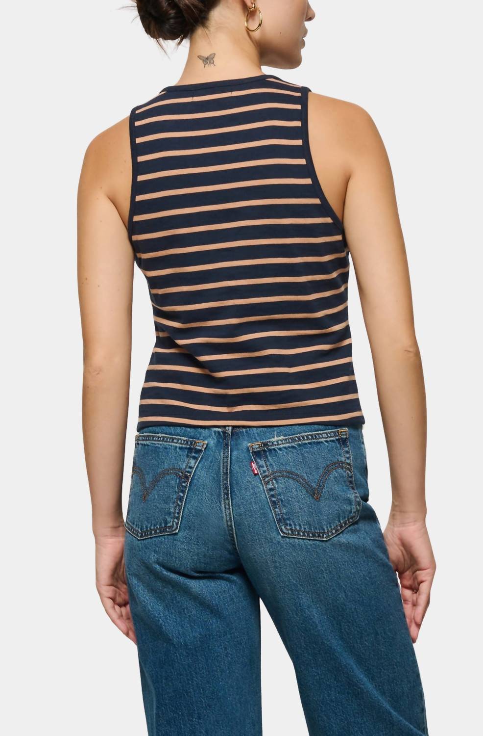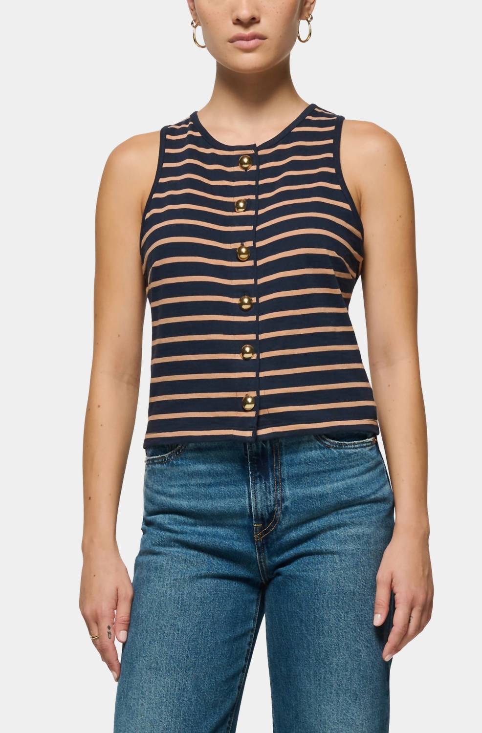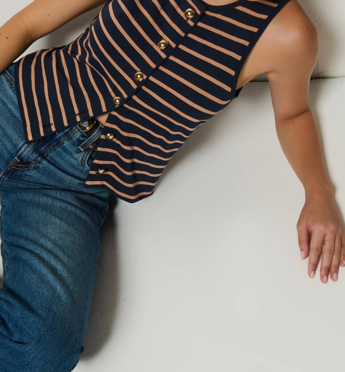 Meet the Abbie Tank by Nation LTD, a must-have for your summer wardrobe with its chic Latte Stripe pattern. This sleeveless top is crafted from high-quality 100% Peruvian Cotton, ensuring both comfort and style. Designed with a crewneck and a functional button closure adorned with Italian gold buttons, it effortlessly transitions from day to night. For care, machine wash and line dry to maintain its minimalist elegance.