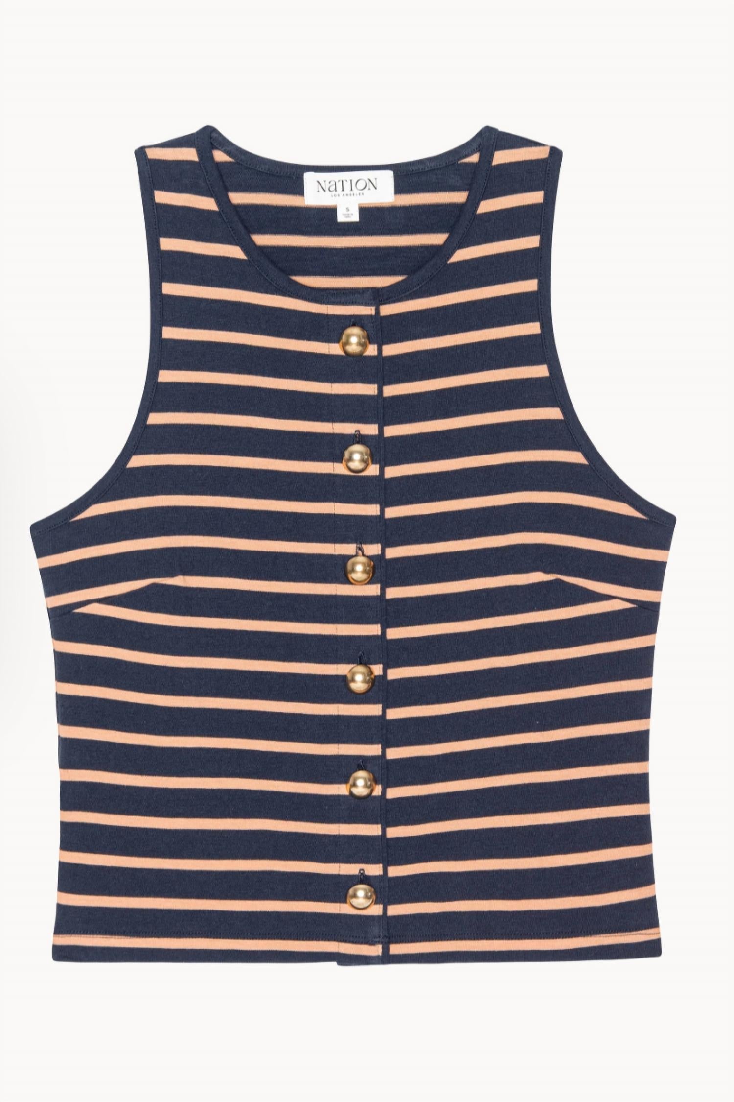 The perfect tank top for those warmer weather seasons. Meet the Abbie Tank by Nation LTD, a must-have for your summer wardrobe with its chic Latte Stripe pattern. This sleeveless top is crafted from high-quality 100% Peruvian Cotton, ensuring both comfort and style. Designed with a crewneck and a functional button closure adorned with Italian gold buttons, it effortlessly transitions from day to night. For care, machine wash and line dry to maintain its minimalist elegance.